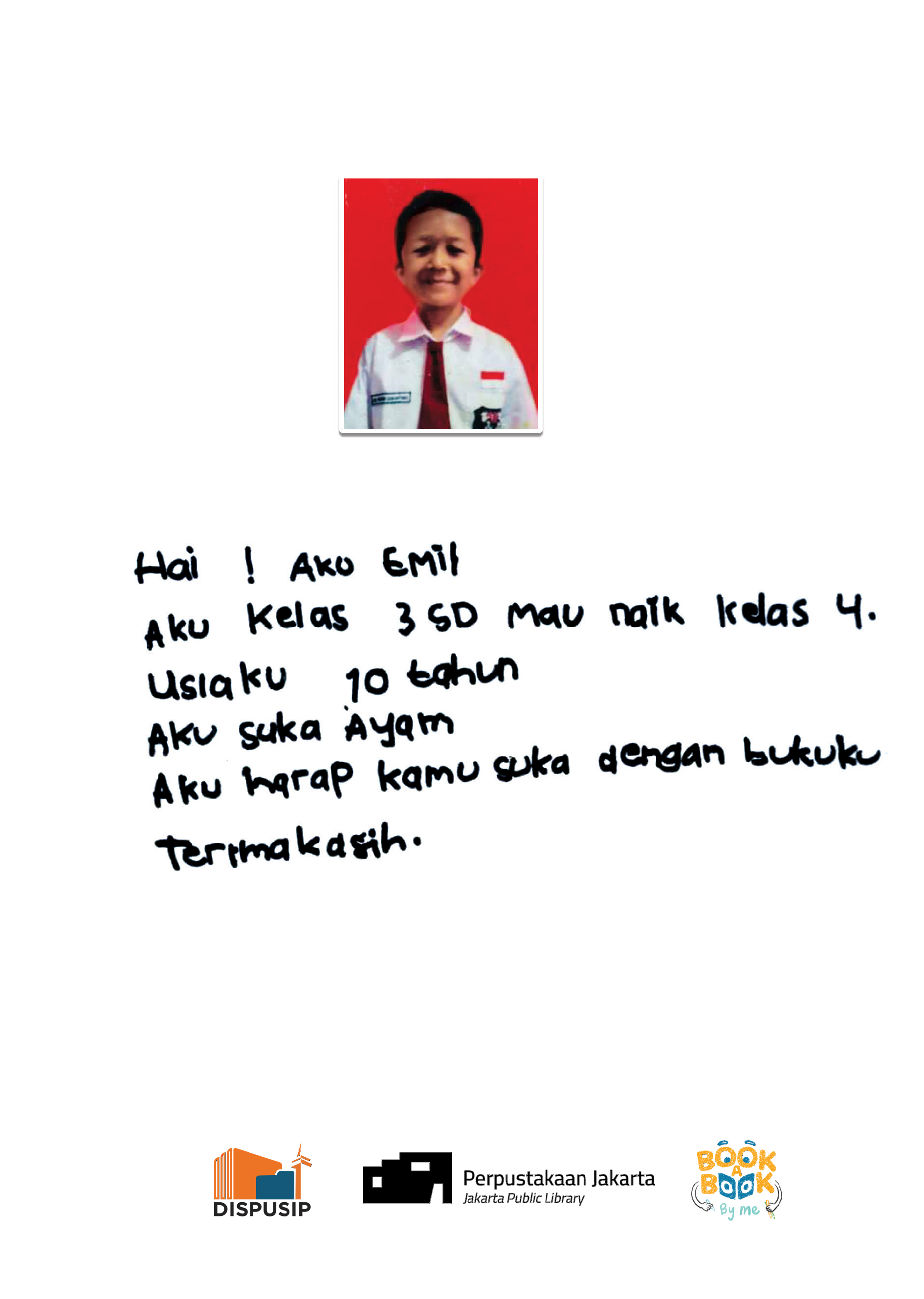 hai, aku emil aku kelas 3 SD mau naik kelas 4SD ,Usiaku 10 tahun, Aku suka Ayam, Aku harap kamu suka dengan bukuku , Terima kasih