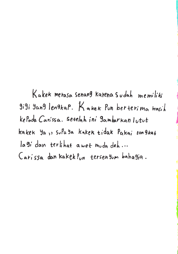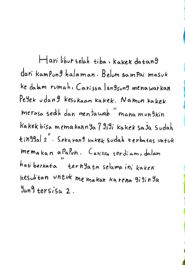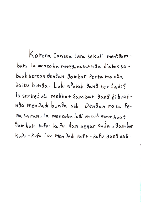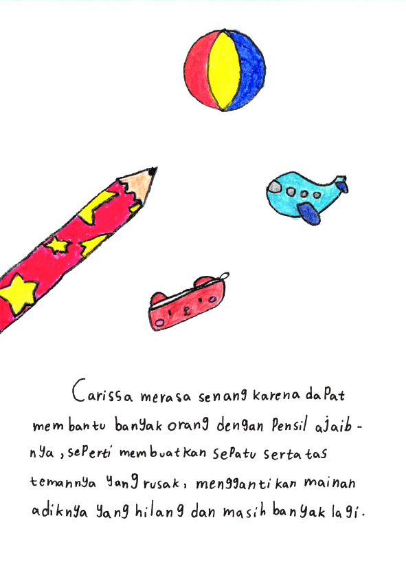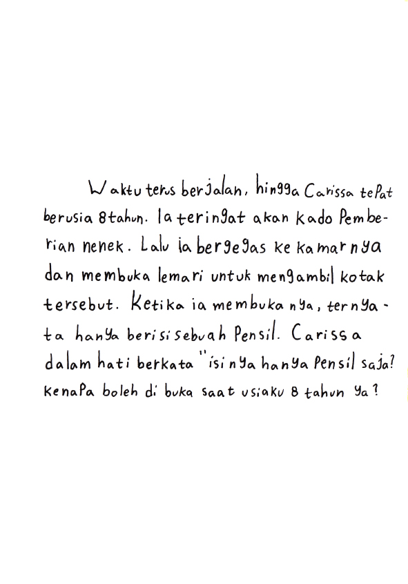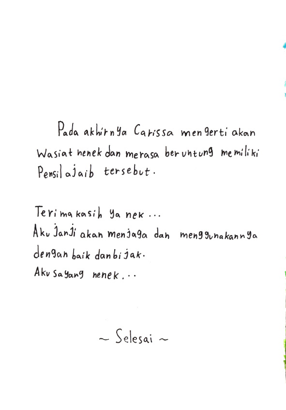 Hallo.. namaku Carissa Ayunda Putri> Usiaku 9 tahun. Ini buku pertamaku yang berjudul "Pensil Ajaib Warisan Nenek". Kira-kira pensil ini bisa apa ya ? Yuk.. Temukan kisah lengkapnya didalam buku ini !