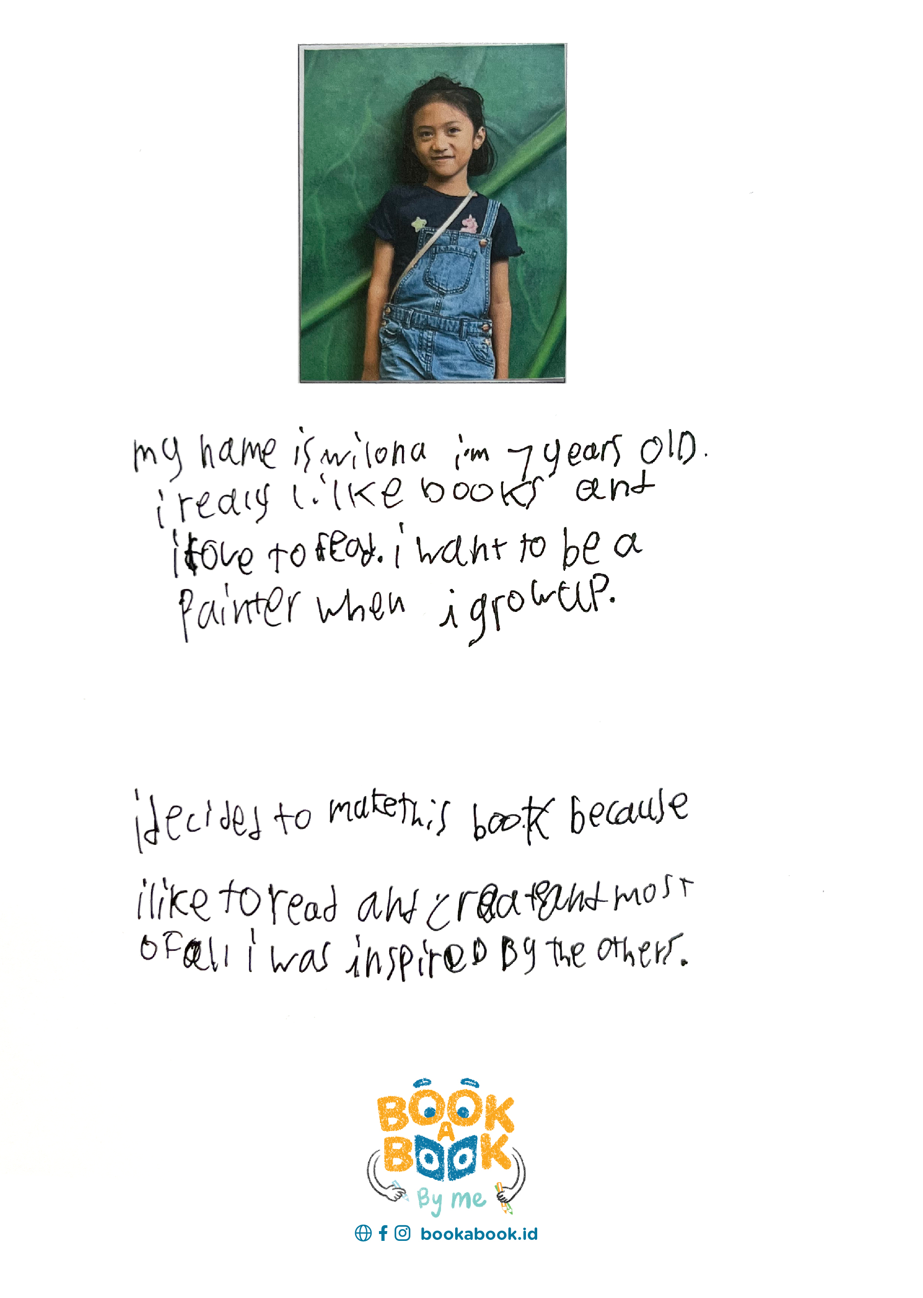 My name is Wilona i'm 7 years old. I really like books and i love to read. I want to be a painter when i grow up. I decided to make this book because i like to read and create and most a fall i was inspired by the others.