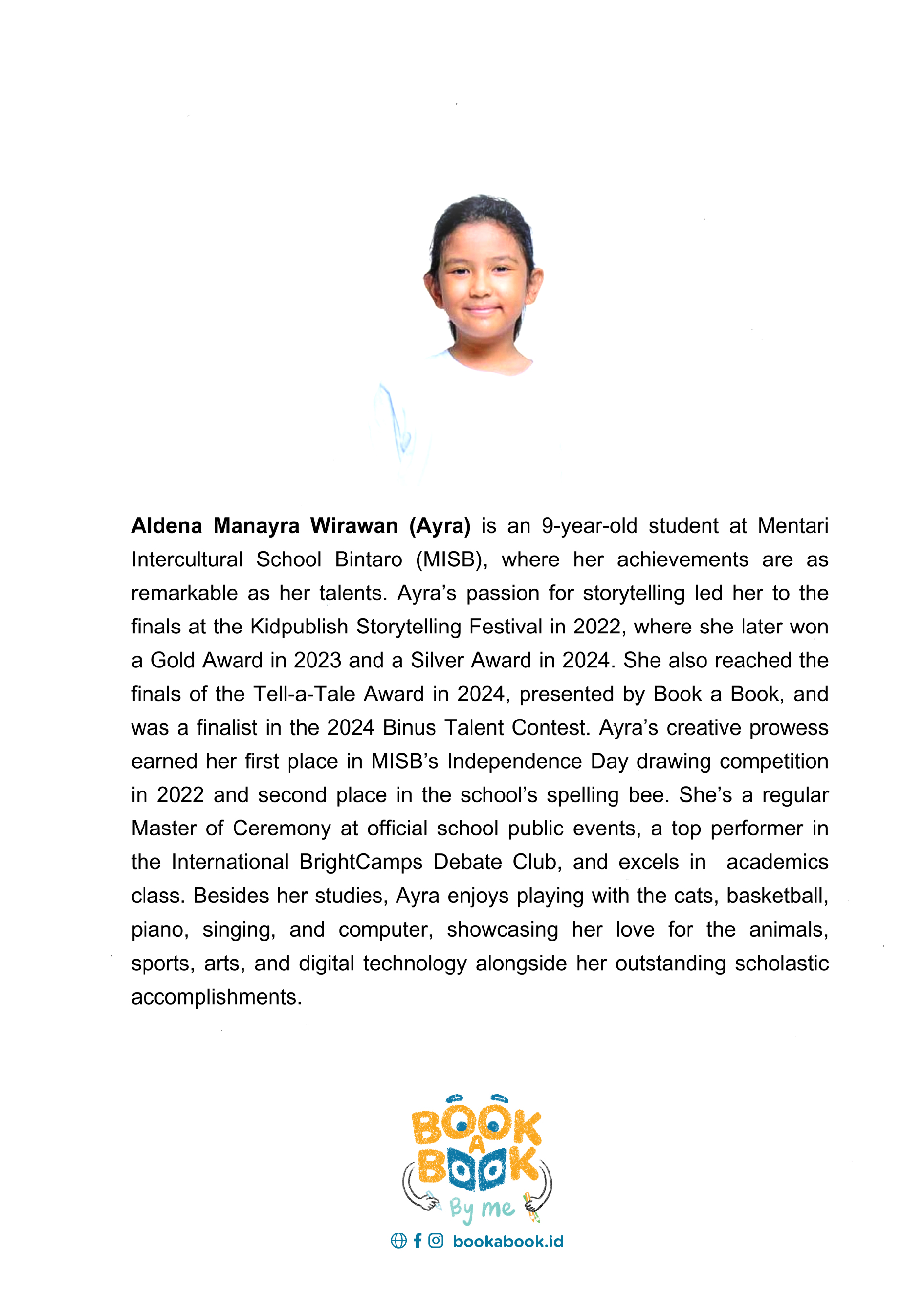 Aldena Manayra Wirawan (Ayra) is an 9-year-old student at Mentari Intercultural School Bintaro (MISB), where her achievements are as remarkable as her talents. Ayra’s passion for storytelling led her to the finals at the Kidpublish Storytelling Festival in 2022, where she later won a Gold Award in 2023 and a Silver Award in 2024. She also reached the finals of the Tell-a-Tale Award in 2024, presented by Book a Book, and was a finalist in the 2024 Binus Talent Contest. Ayra’s creative prowess earned her first place in MISB’s Independence Day drawing competition in 2022 and second place in the school’s spelling bee. She’s a regular Master of Ceremony at official school public events, a top performer in the International BrightCamps Debate Club, and excels in academics class. Besides her studies, Ayra enjoys playing with the cats, basketball, piano, singing, and computer, showcasing her love for the animals, sports, arts, and digital technology alongside her outstanding scholastic accomplishments.