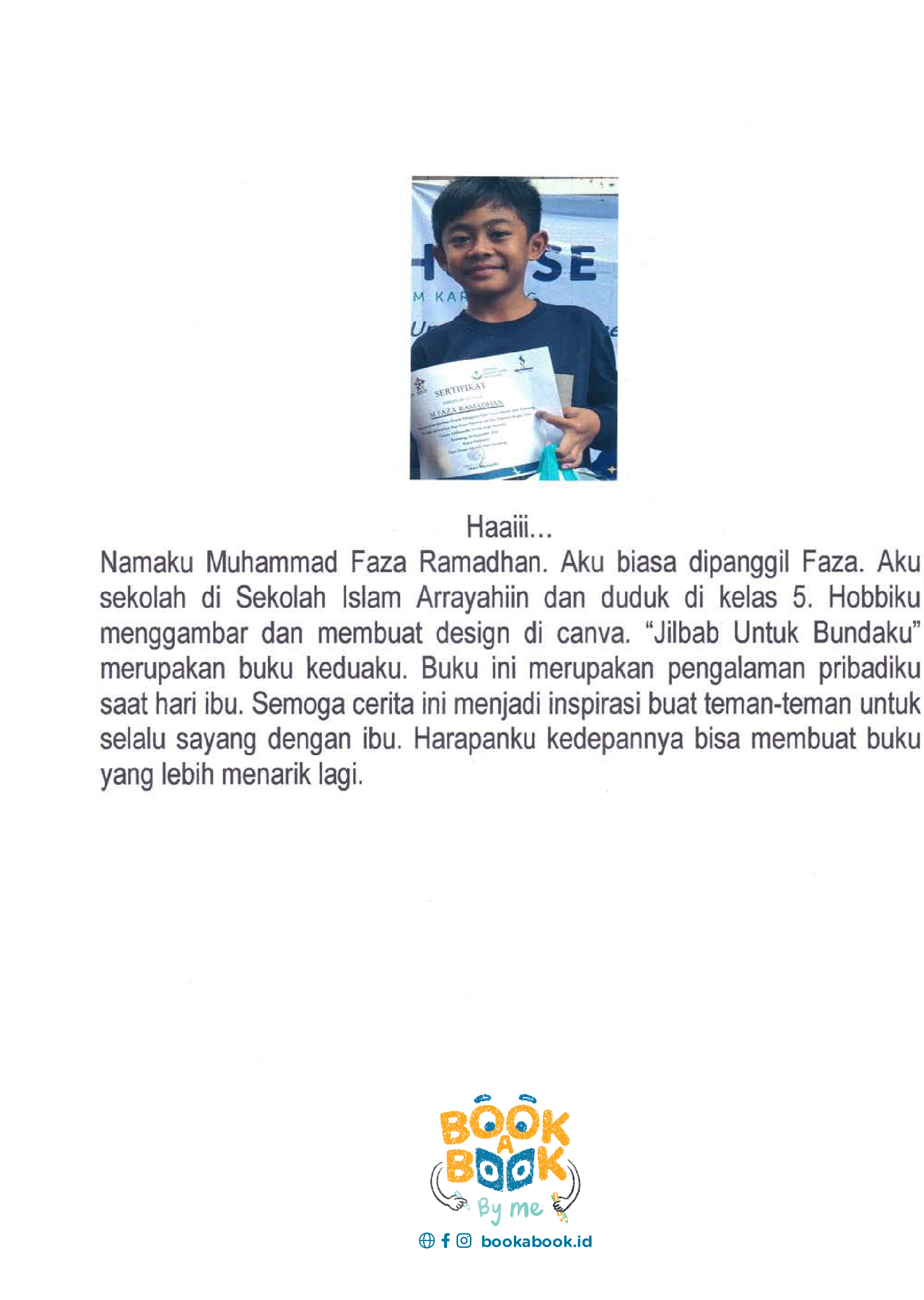 Haaiii... Namaku Muhammad Faza Ramadhan. Aku biasa dipanggil Faza. Aku sekolah di Sekolah Islam Arrayahiin dan duduk di kelas 5. Hobbiku menggambar dan membuat design di canva. "Jilbab Untuk Bundaku" merupakan buku keduaku. Buku ini merupakan pengalaman pribadiku saat hari ibu. Semoga cerita ini menjadi inspirasi buat teman-teman untuk selalu sayang dengan ibu. Harapanku kedepannya bisa membuat buku yang lebih menarik lagi.