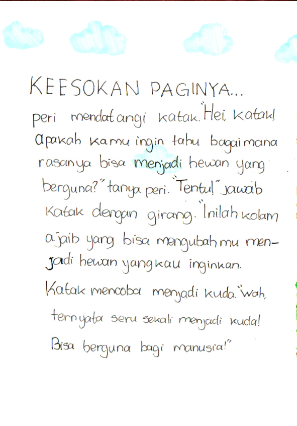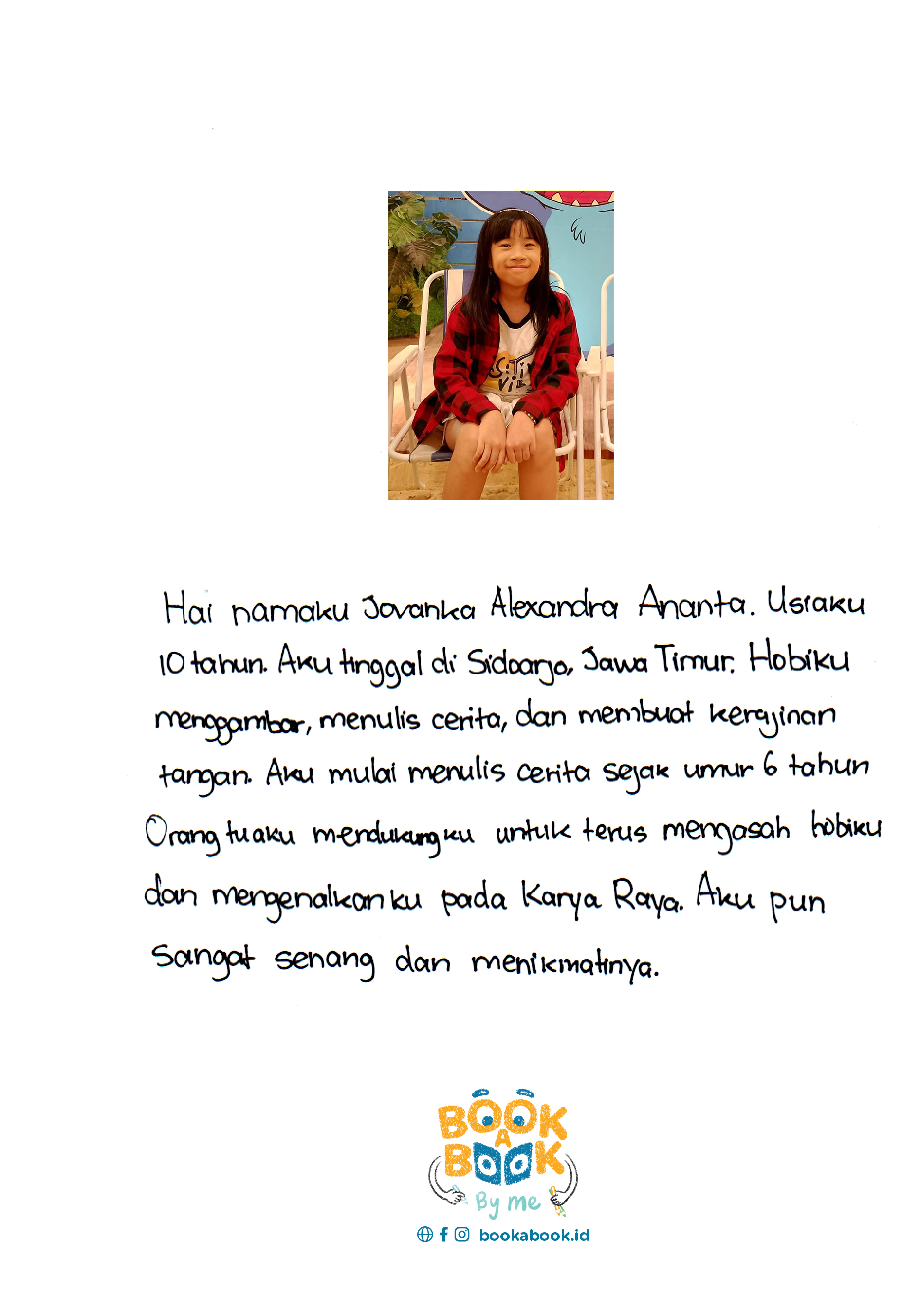 Hai, namaku Jovanka Alexandra Ananta. Usiaku 10 tahun. Aku tinggal di Sidoarjo, Jawa Timur. Hobiku menggambar, mewarnai, menulis cerita dan membuat kerajinan tangan. Aku mulai suka menulis cerita sejak umur 6 tahun. Orang tuaku mendukungku untuk mengasah hobiku dan memperkenalkan pada Karya Raya. Aku pun sangat senang dan menikmatinya.
