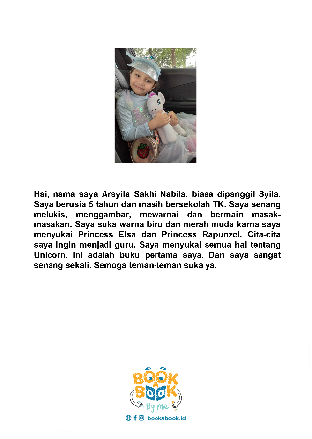 Hai, nama saya Arsyila Sakhi Nabila, biasa dipanggil Syila. Saya berusia 5 tahun dan masih bersekolah TK. Saya senang melukis, menggambar, mewarnai dan bermain masak- masakan. Saya suka warna biru dan merah muda karna saya menyukai Princess Elsa dan Princess Rapunzel. Cita-cita saya ingin menjadi guru. Saya menyukai semua hal tentang Unicorn. Ini adalah buku pertama saya. Dan saya sangat senang sekali. Semoga teman-teman Suka ya.