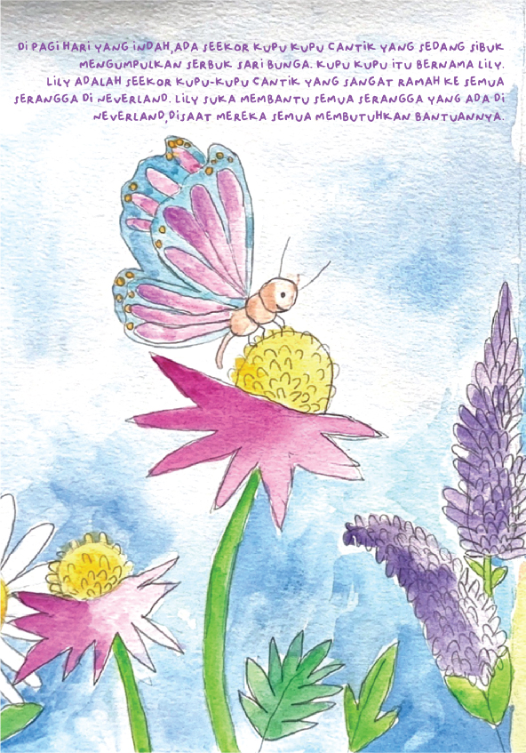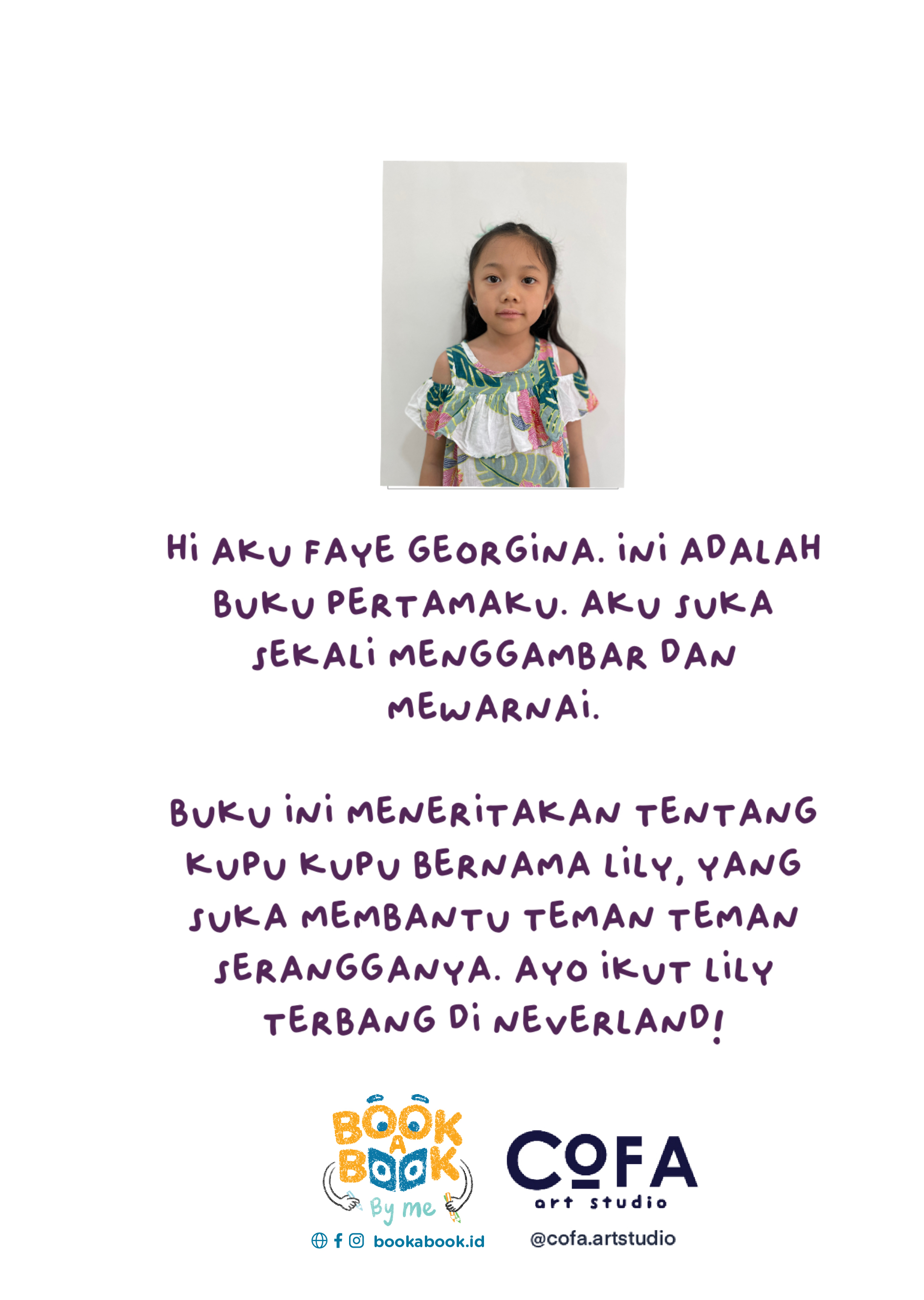 Hi aku Faye Georgina. Ini adalah buku pertamaku. Aku suka sekali menggambar dan mewarnai. Buku ini menceritakan tentang kupu kupu bernama Lily, yang suka membantu teman teman serangganya. Ayo ikut Lily terbang di Neverland!