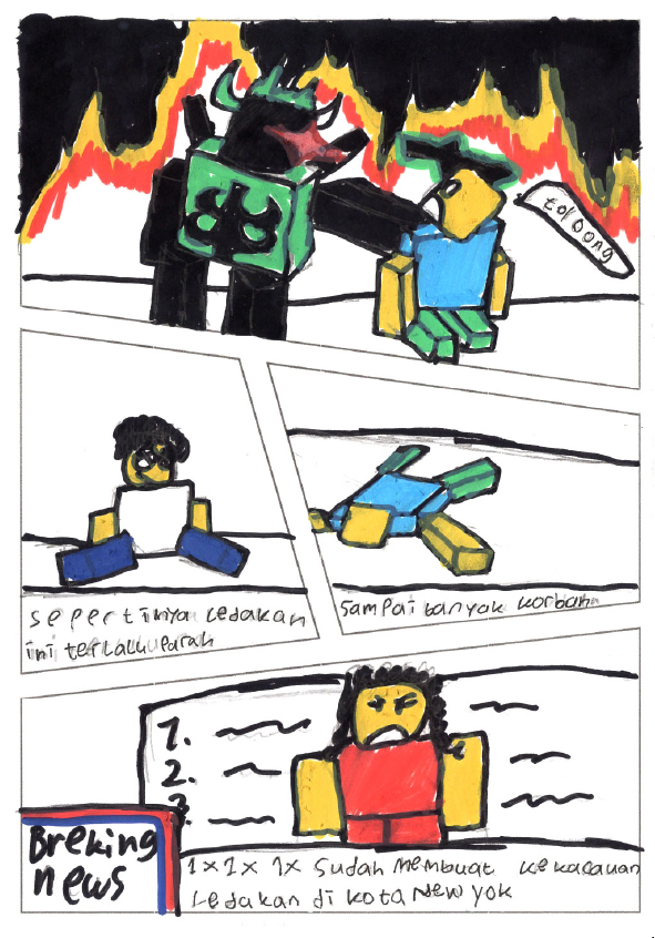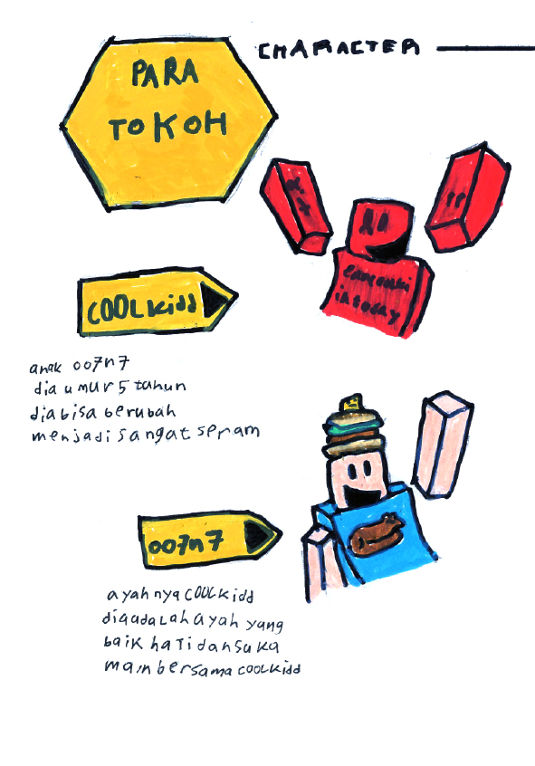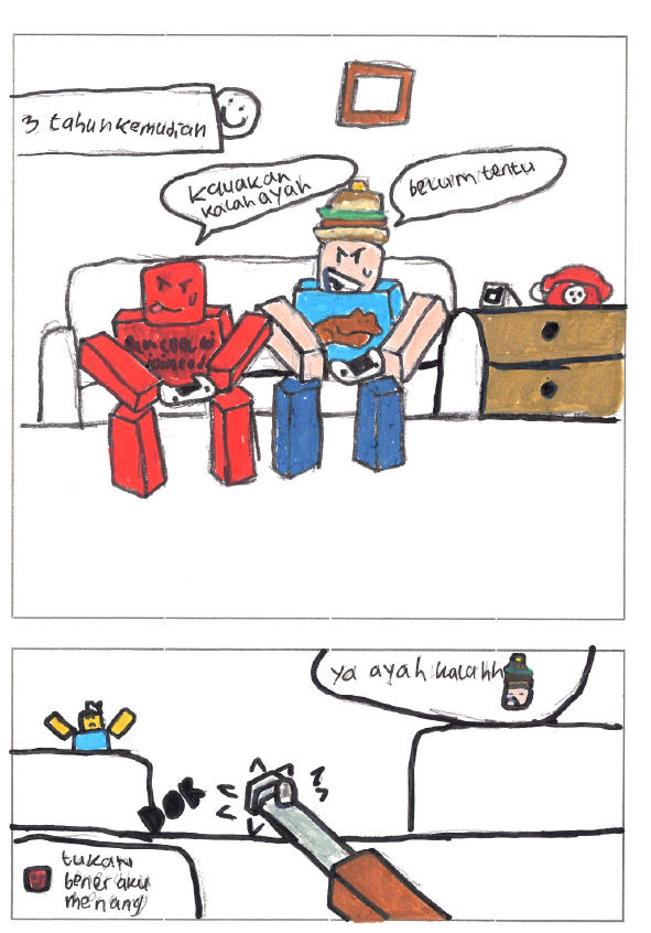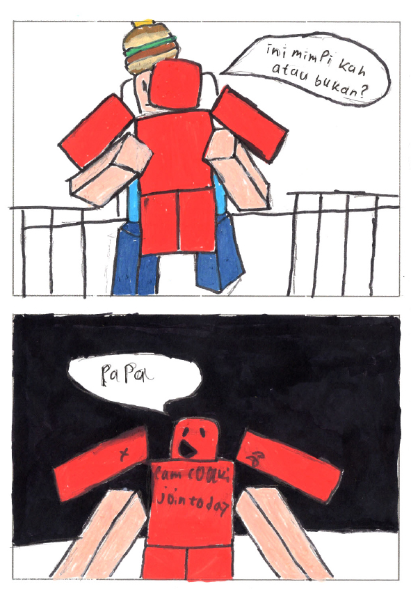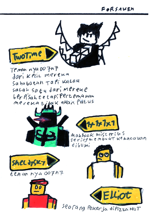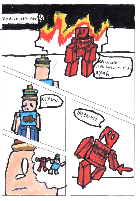 Aku lagi bikin komik baru, inspirasinya dari game Roblox yang judulnya Forsaken. Ceritanya tentang anak yang ditemukan dalam kotak. Waktu dibuka, ternyata ada bayi cowok di dalamnya, matanya nyala warna merah kayak karakter Coolkidd di Roblox. Si penemu tinggal sendirian, jadi dia ngerasa kayak jadi ayahnya. Setiap hari diajarkan cara ngomong, belajar dan main game. Rasanya kayak punya keluarga beneran. Dulu dikira hidup bakal sepi, tapi sekarang punya temen sekaligus ayah yang selalu ada buat main bareng. Hari itu, Coolkidd janji dalam hati kalau kita bakal terus bareng-bareng, nggak bakal ada yang “forsaken” lagi