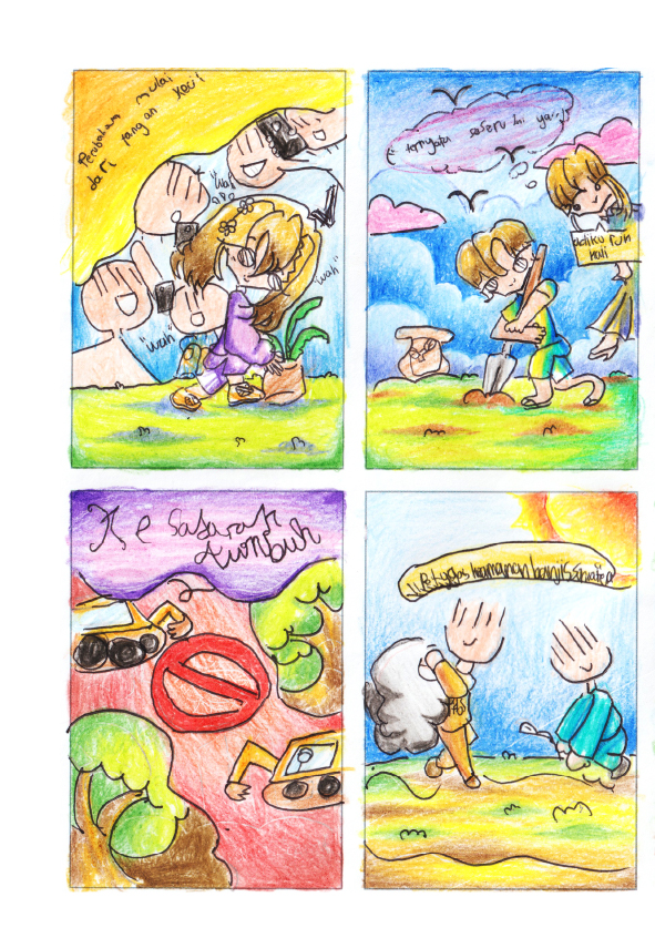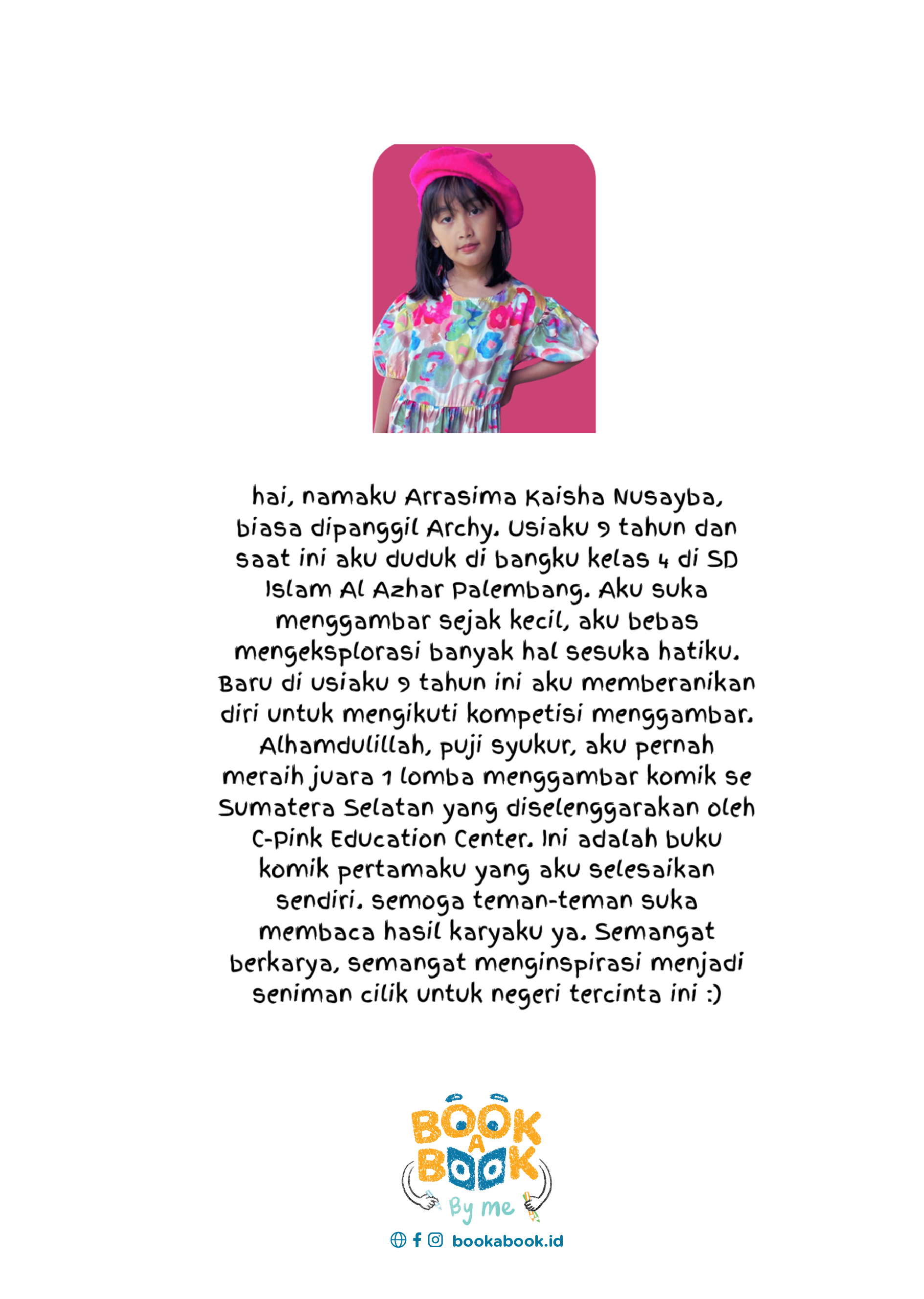 hai, namaku Arrasima Kaisha Nusayba, biasa dipanggil Archy. Usiaku 9 tahun dan saat ini aku duduk di bangku kelas 4 di SD Islam Al Azhar Palembang. Aku suka menggambar sejak kecil, aku bebas mengeksplorasi banyak hal sesuka hatiku. Baru di usiaku 9 tahun ini aku memberanikan diri untuk mengikuti kompetisi menggambar. Alhamdulillah, puji syukur, aku pernah meraih juara 1 lomba menggambar komik se Sumatera Selatan yang diselenggarakan oleh C-Pink Education Center. Ini adalah buku komik pertamaku yang aku selesaikan sendiri. semoga teman-teman suka membaca hasil karyaku ya. Semangat berkarya, semangat menginspirasi menjadi seniman cilik untuk negeri tercinta ini :)