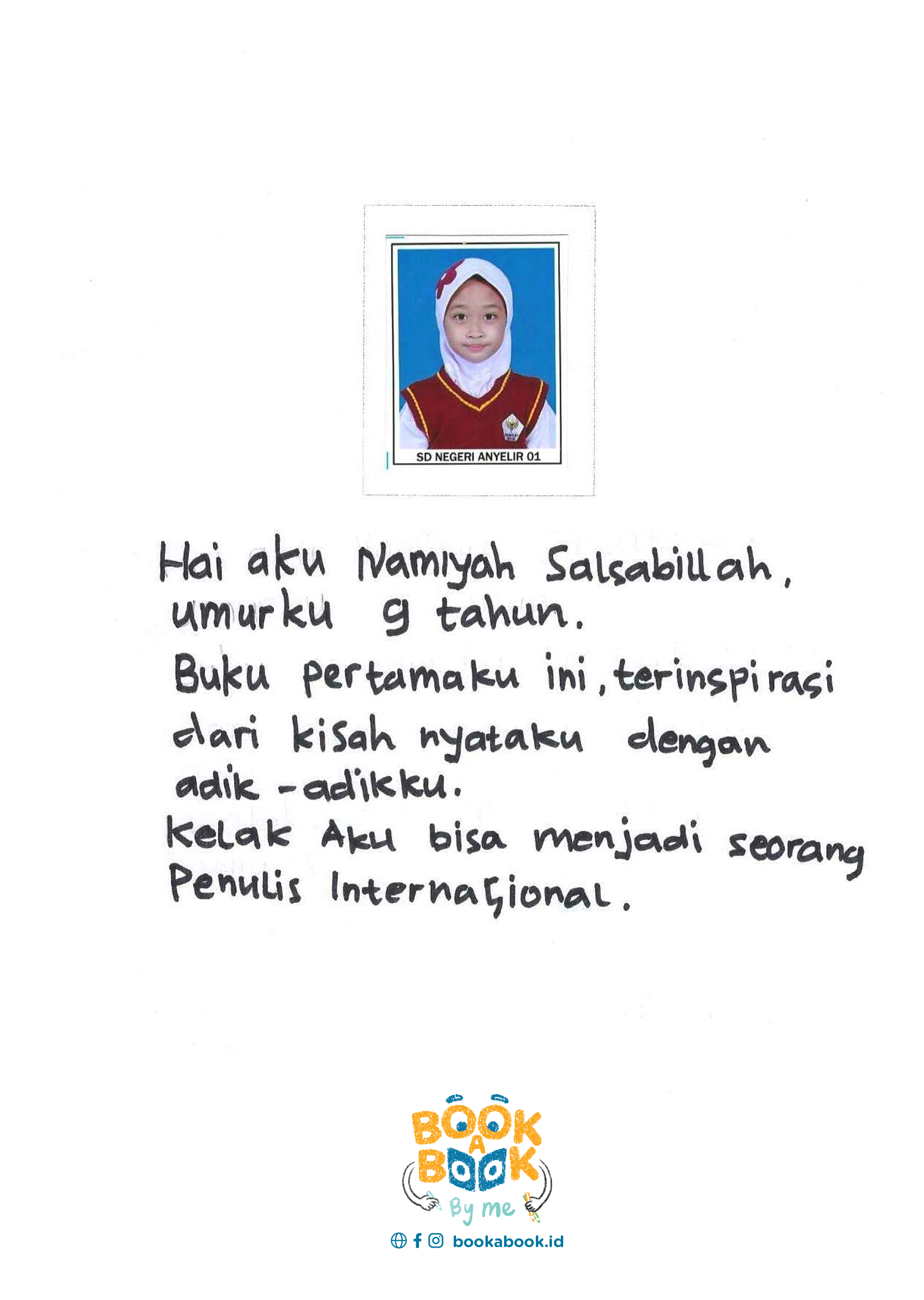 Hai aku Namiyah Salsabillah, umurku 9 tahun. Buku pertamaku ini, terinspirasi dari kisah nyataku dengan adik-adikku. Kelak aku bisa menjadi seorang penulis internasional.