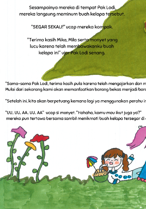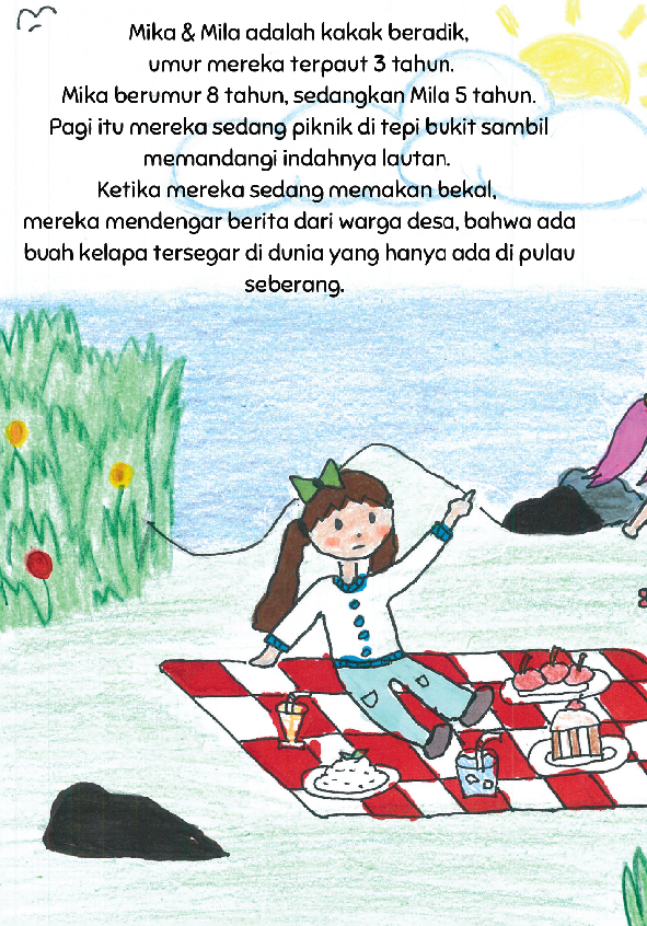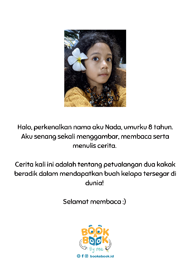 Halo, perkenalkan nama aku Nada, umurku 8 tahun. Aku senang sekali menggambar, membaca serta menulis cerita. Cerita kali ini adalah tentang petualangan dua kakak beradik dalam mendapatkan buah kelapa tersegar di dunia! Selamat membaca :)