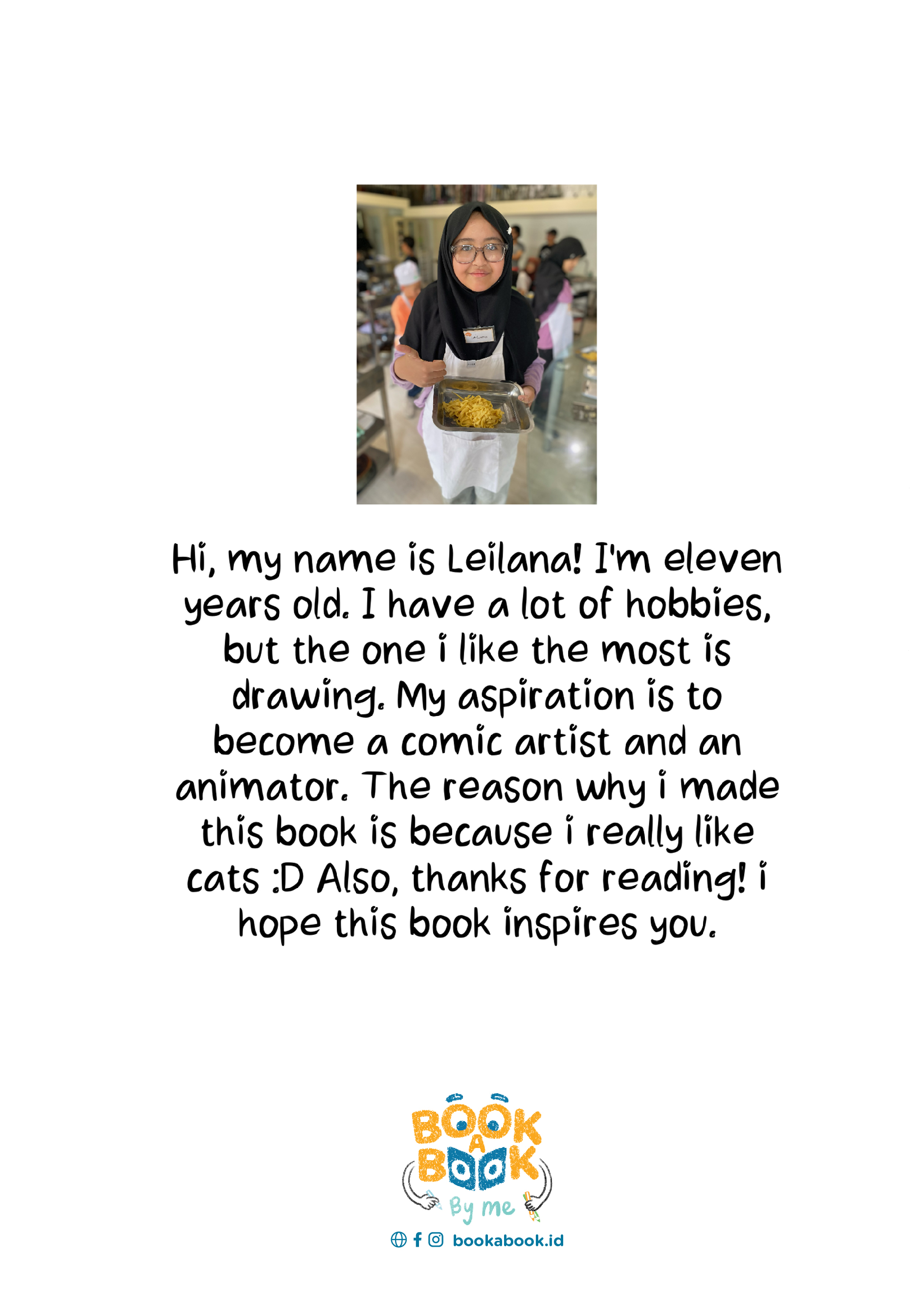 Hi, my name is Leilana! I’m eleven years old. I have a lot hobbies, but the one i like the most is drawing. My aspiration is to become a comic artist and an animator. The reason why i made this book is because i really like cats :D Also, thanks for reading! i hope this book inspires you.