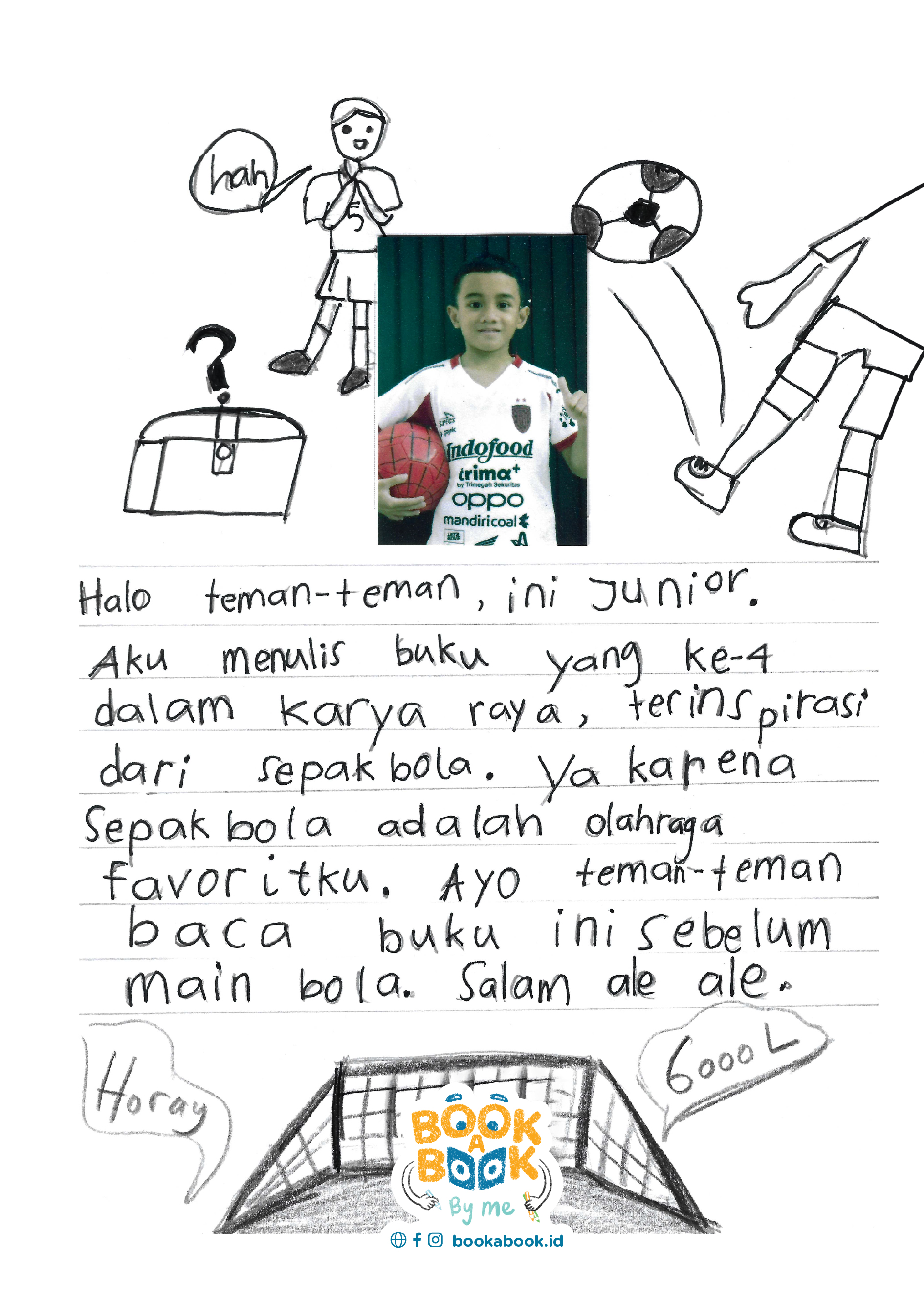 Halo teman - teman, ini Junior. Aku menulis buku yang ke -4 dalam karya raya, terinspirasi dari sepakbola. Ya karena sepakbola adalah olahraga favoritku. Ayo teman - teman baca buku ini sebelum main bola. Salam ale-ale.