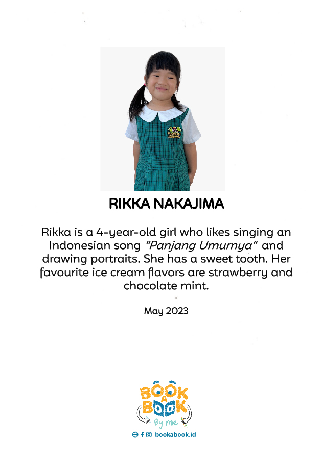 Rikka is a 4-year-old girl who likes singing an Indonesian song "Panjang Umurnya" and drawing portraits. She has a sweet tooth. Her favourite ice cream flavors are strawberry and chocolate mint. May 2023