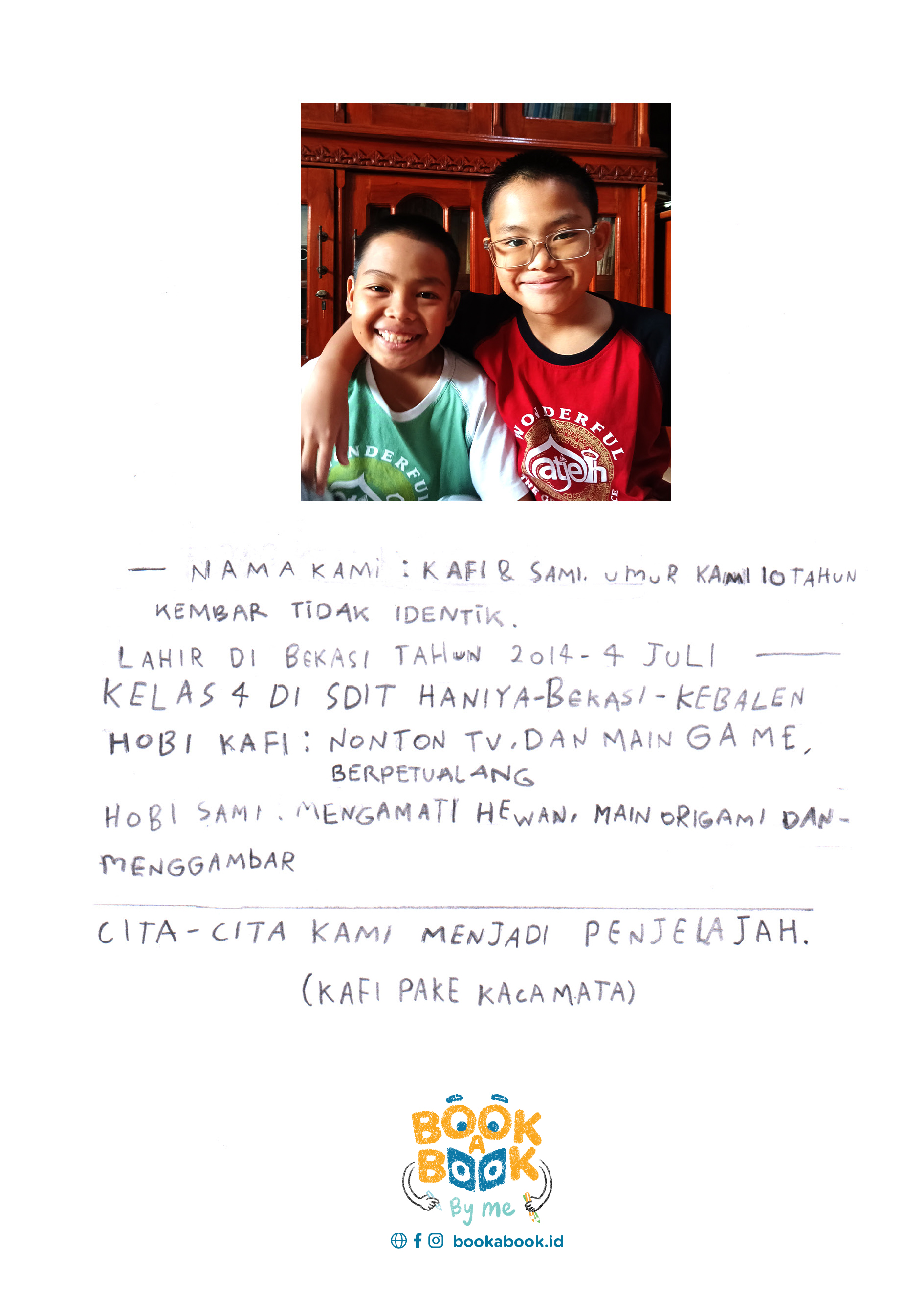 Nama Kami: Kafi & Sami. Umur kami 10 tahun. Kami kembar tidak identik. Lahir di Bekasi tahun 2014, 04 July. Kelas 4 di SDIT Haniya Bekasi - Kebalen. Hobby Kafi: Nonton TV, main Game & berpetualang. Hobby Sami: mengamati hewan, main origami & menggambar. Cita cita Kami menjadi penjelajah (Kafi pake kacamata)