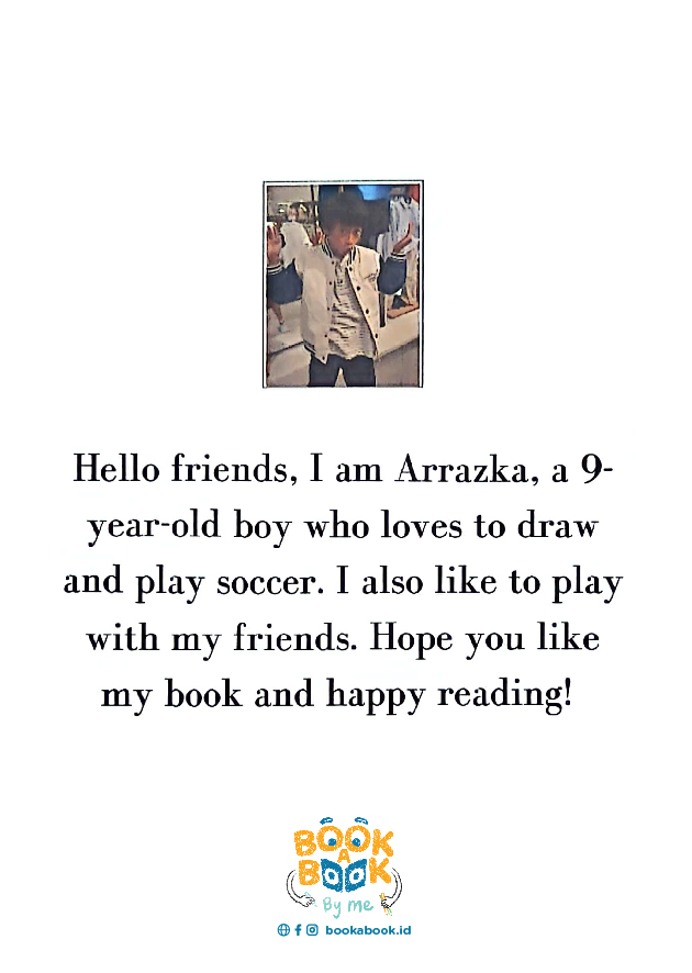 Hello friends, I am Arrazka, a 9- year-old boy who loves to draw and play soccer. I also like to play with my friends. Hope you like my book and happy reading!