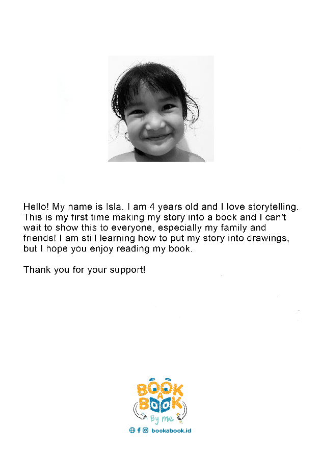 Hello! My name is Isla. I am 4 years old and I love storytelling This is my first time making my story into a book and I can't wait to show this to everyone, especially my family and friends! I am still learning how to put my story into drawings, but I hope you enjoy reading my book. Thank you for your support!