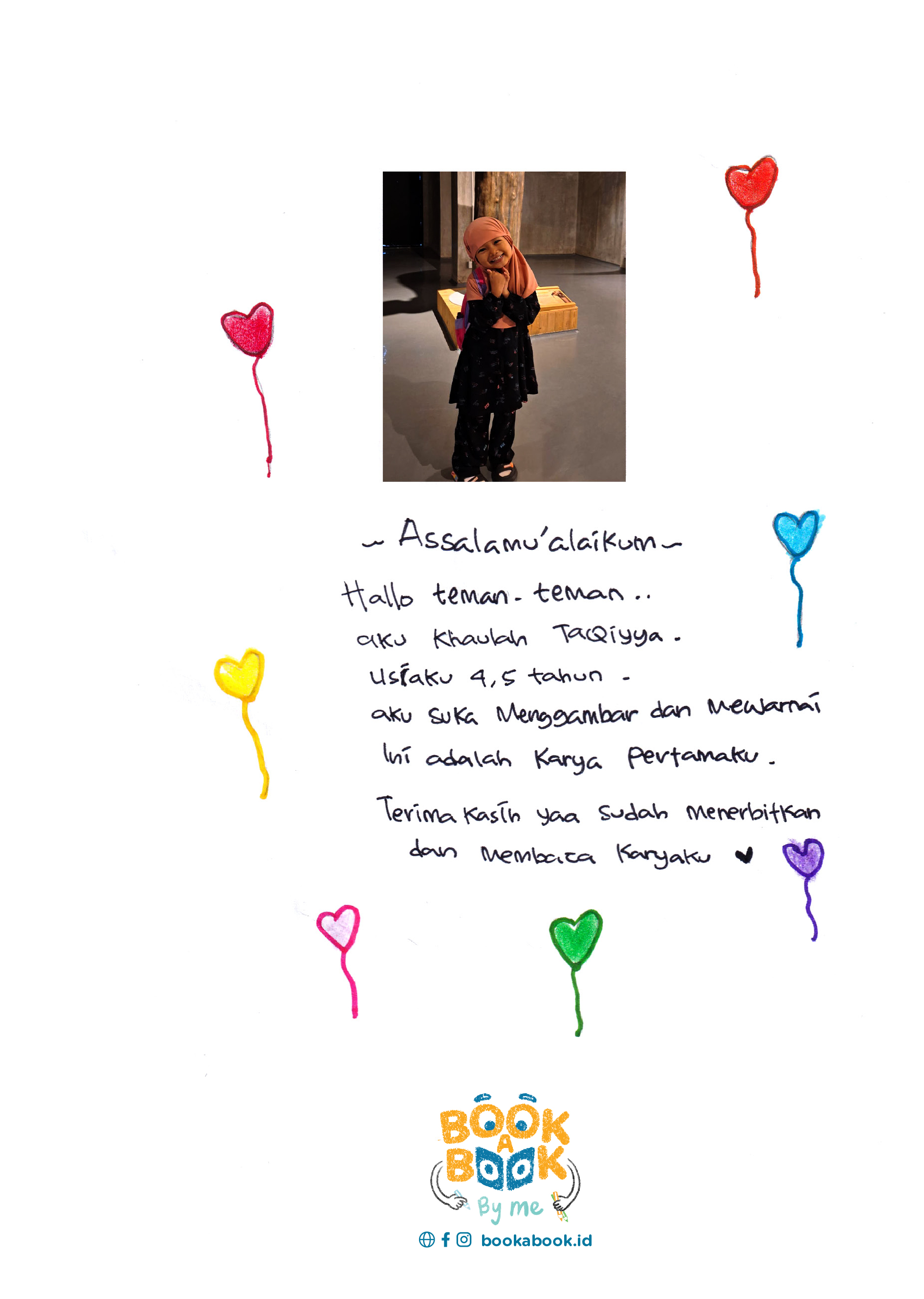 Assalamualaikum Hallo teman-teman.. aku Khaulah Taqiyya. Usiaku 4,5 tahun. Aku suka menggambar dan mewarnai. Ini adalah karya pertamaku. Terima kasih yaa sudah menerbitkan dan membaca karyaku.