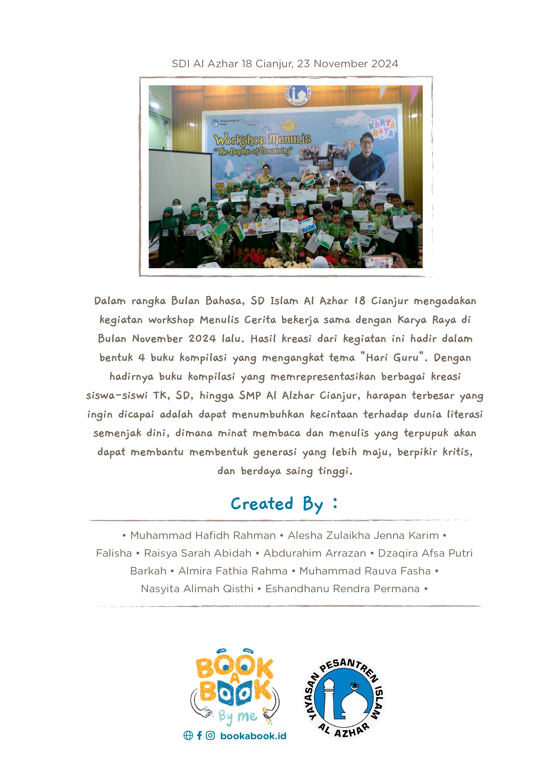 Dalam rangka Bulan Bahasa, SD Islam Al Azhar 18 Cianjur mengadakan kegiatan workshop Menulis Cerita bekerja sama dengan Karya Raya di Bulan November 2024 lalu. Hasil kreasi dari kegiatan ini hadir datam bentuk 4 buku kompilasi yang mengangkat tema "Hari Guru". Dengan hadirnya buku kompilasi yang memrepresentasikan berbagai kreasi siswa—siswi TK, SD, hingga SMP Al Alzhar Cianjur, harapan terbesar yang ingin dicapai adalah dapat menumbuhkan kecintaan terhadap dunia literasi semenjak dini, dimana minat membaca dan menulis yang terpupuk akan dapat membantu membentuk generasi yang lebih maju, berpikir kritis, dan berdaya saing tinggi.