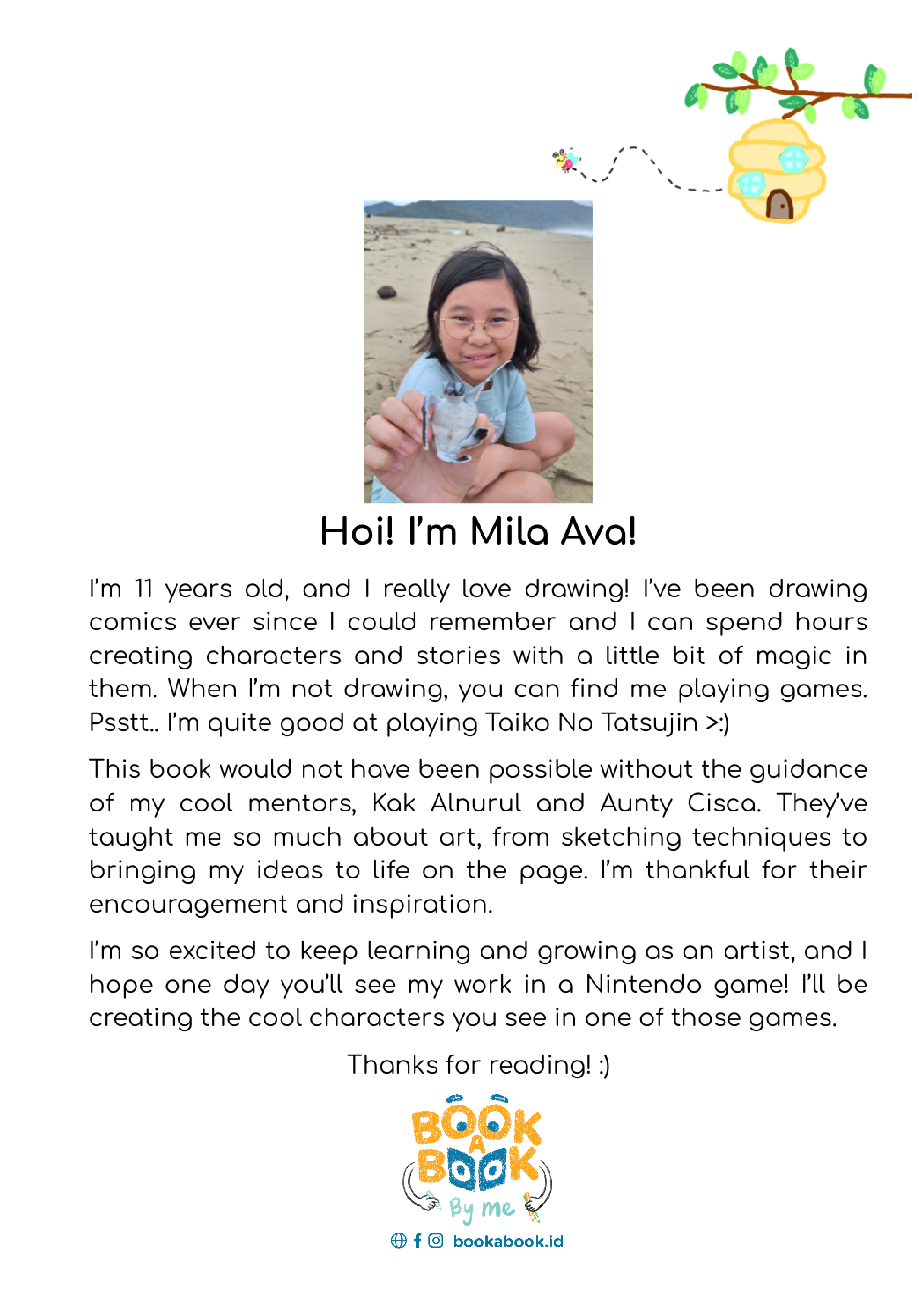 Hoi! I’m Mila Ava! I’m 11 years old, and I really love drawing! I’ve been drawing comics ever since I could remember and I can spend hours creating characters and stories with a little bit of magic in them. When I’m not drawing, you can find me playing games. Psstt.. I’m quite good at playing Taiko No Tatsujin >:) This book would not have been possible without the guidance of my cool mentors, Kak Alnurul and Aunty Cisca. They’ve taught me so much about art, from sketching techniques to bringing my ideas to life on the page. I’m thankful for their encouragement and inspiration. I’m so excited to keep learning and growing as an artist, and I hope one day you’ll see my work in a Nintendo game! I’ll be creating the cool characters you see in one of those games. Thanks for reading! :)