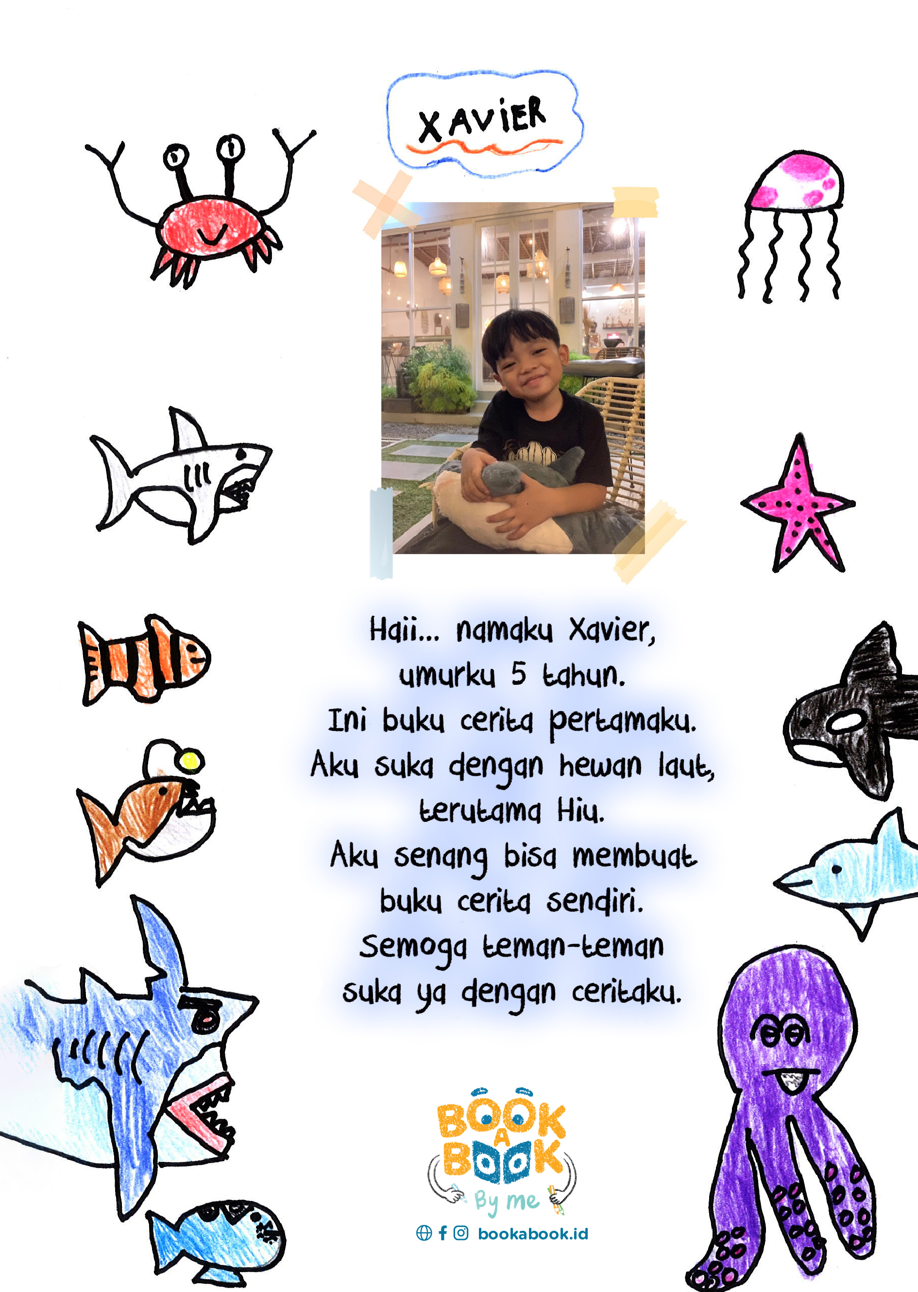 Haii... namaku Xavier, umurku 5 tahun. Ini buku cerita pertamaku. Aku suka dengan hewan laut, terutama Hiu. Aku senang bisa membuat buku cerita sendiri. Semoga teman-teman suka ya dengan ceritaku.