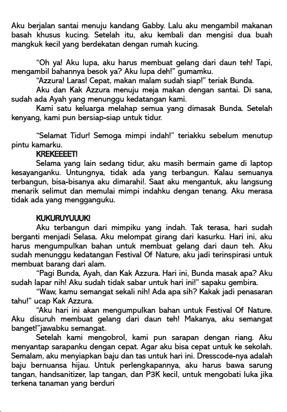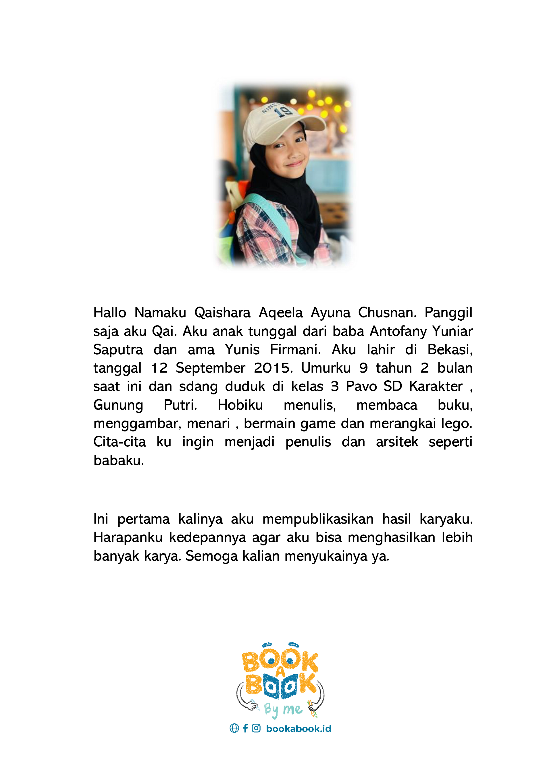Hallo Namaku Qaishara Aqeela Chusnan. Panggil saja aku Qai. Aku anak tunggal dari baba Antofany Yuniar Saputra dan ama Yunis Firmani. Aku lahir di Bekasi, tanggal 12 September 2015. Umurku 9 tahun 2 bulan saat ini dan sedang duduk di kelas 3 Pavo SD Karakter, Gunung Putri. Hobiku menulis, membaca buku, menggambar, menari, bermain game dan merangkai lego. Cita-citaku ingin menjadi penulis dan arsitek seperti babaku. Ini pertama kalinya mempublikasikan hasil karyaku. Harapanku kedepannya agar aku bisa menghasilkan lebih banyak karya. Semoga kalian menyukainya ya.