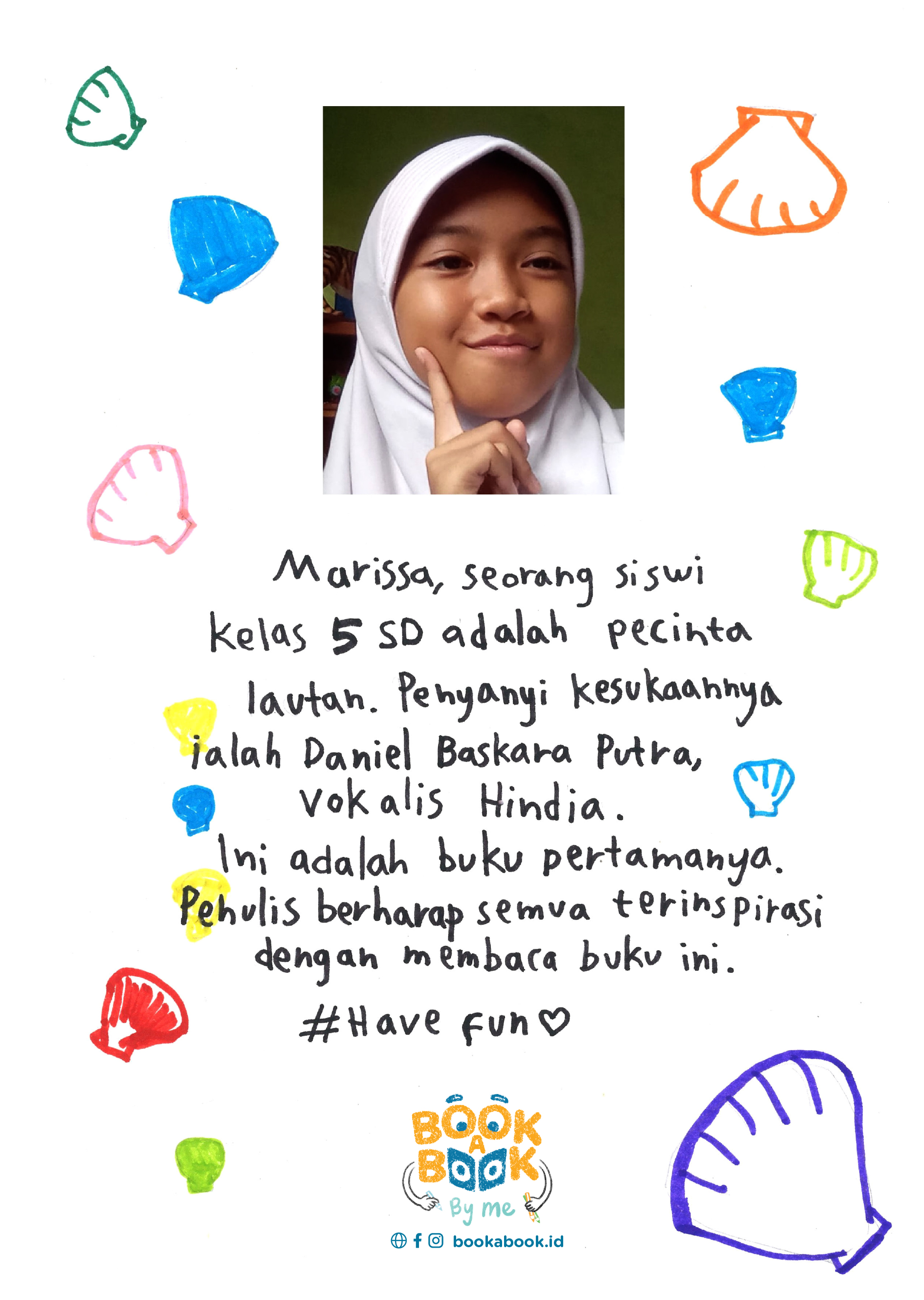 Marissa, seorang siswi kelas 5 Sekolah Dasar, adalah pecinta lautan. Penyanyi kesukaannya ialah Baskara Putra - Hindia. Ini adalah buku pertamanya. Penulis berharap semua terinspirasi dengan membaca buku ini. Have fun!