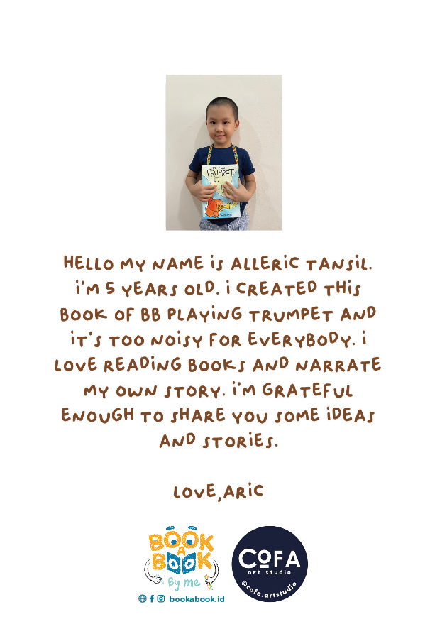 HELLO MY NAME IS ALLERIC TANSIL. I'M 5 YEARS OLD. I CREATED THIS BOOK OF BB PLAYING TRUMPER AND IT'S TOO NOISY FOR EVERYBODY. I LOVE READING BOOKS AND NARRATE MY OWN STORY. I'M GRATEFUL ENOUGH TO SHARE YOU SOME IDEAS AND STORIES. LOVE, ARIC