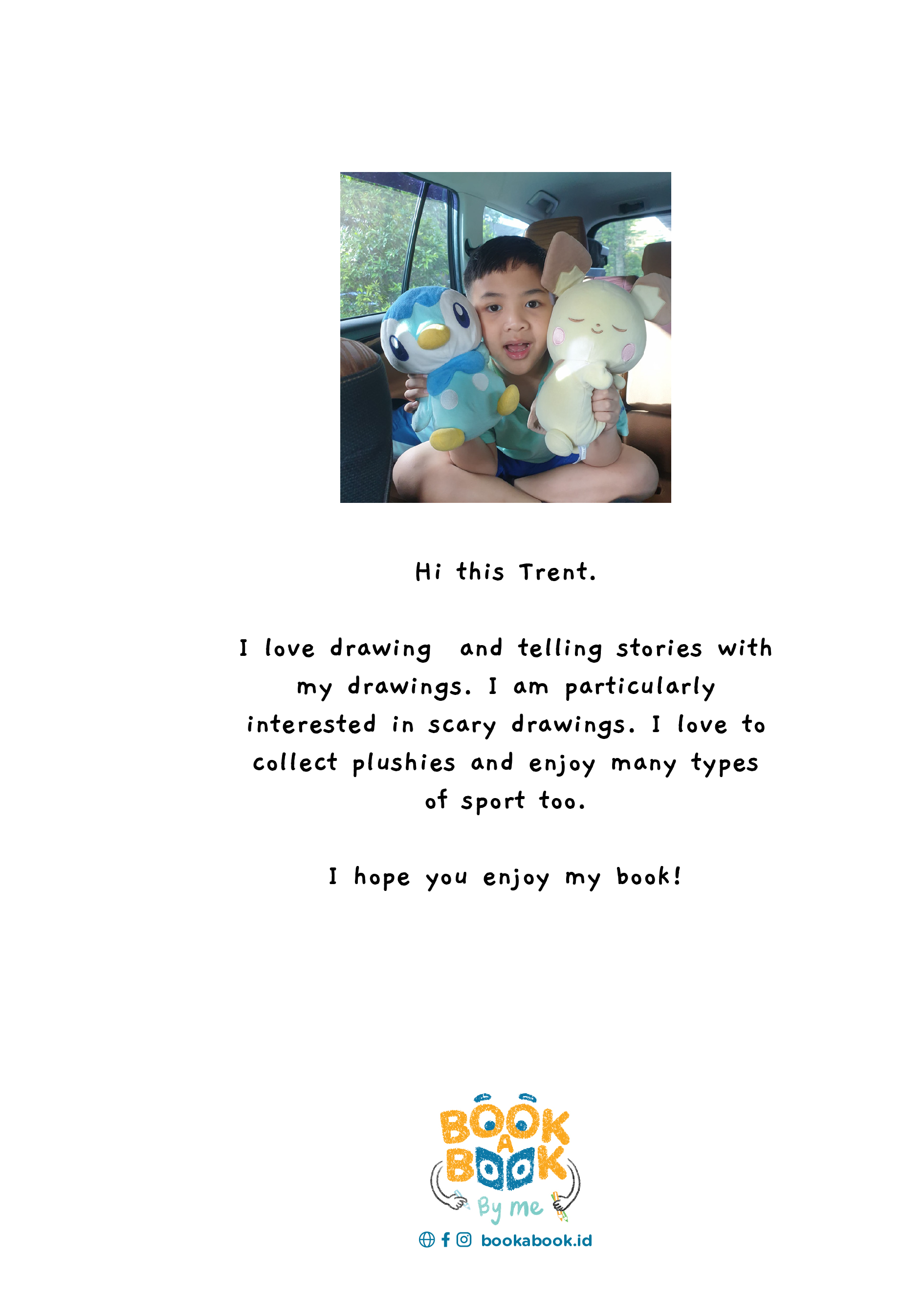 Hi this Trent. I love drawing and telling stories with my drawings. I am particularly interested in scary drawings. I love to collect plushies and enjoy many types of sport too. I hope you enjoy my book!