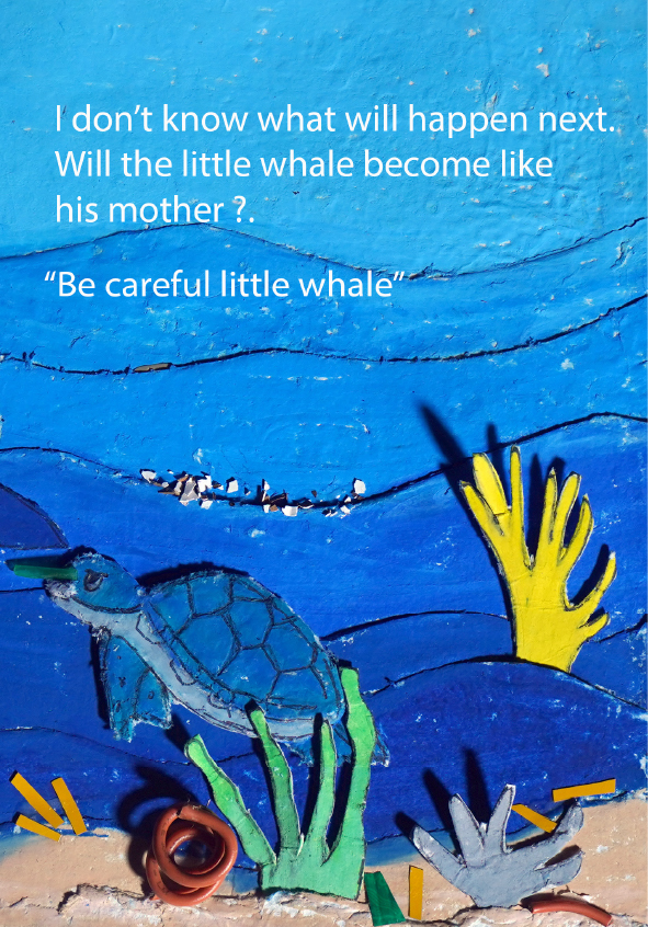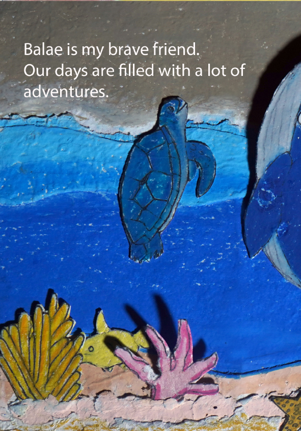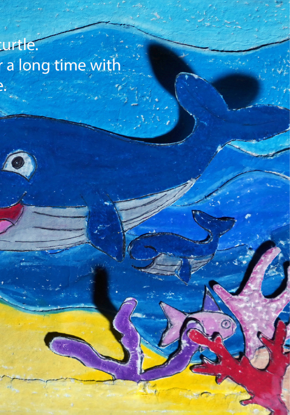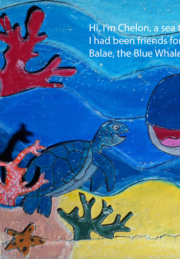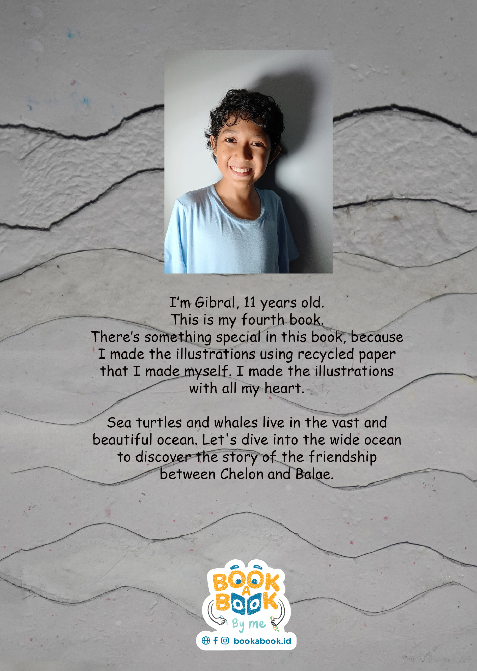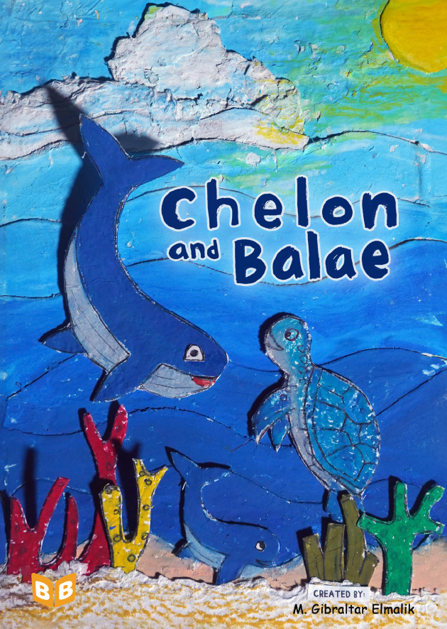 I'm Gibral, 11 years old. This is my fourth book. There's something special in this book, because I made the illustrations using recycled paper that I made myself. I made the illustrations with all my heart. Sea turtles and whales live in the vast and beautiful ocean. Let's dive into the wide ocean to discover the story of the friendship between Chelon and Balae.