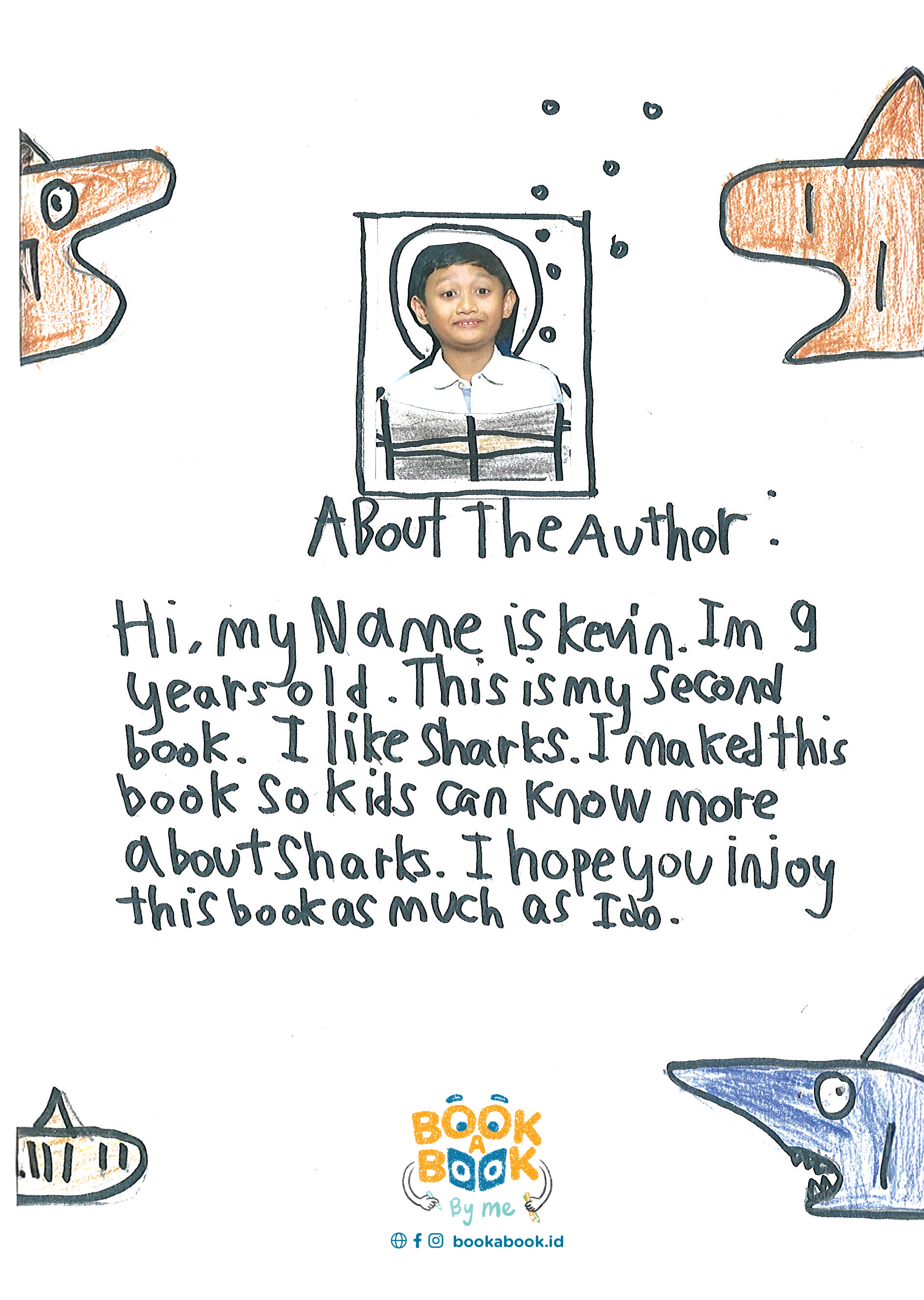 Hi, my name is Kevin. I'm 9 years old. This is my second book. I like sharks. I made this book so kids can know more about sharks. I hope you enjoy this book as much as I do.