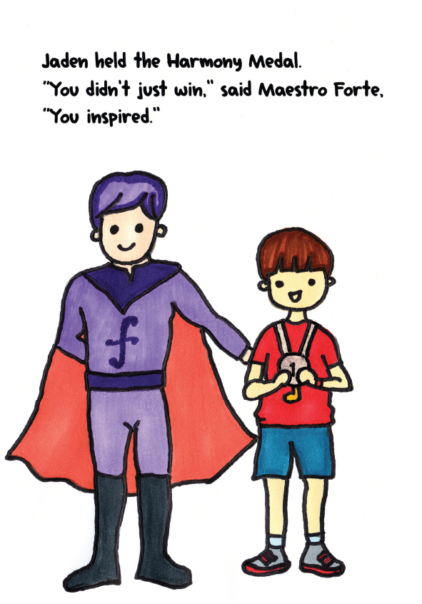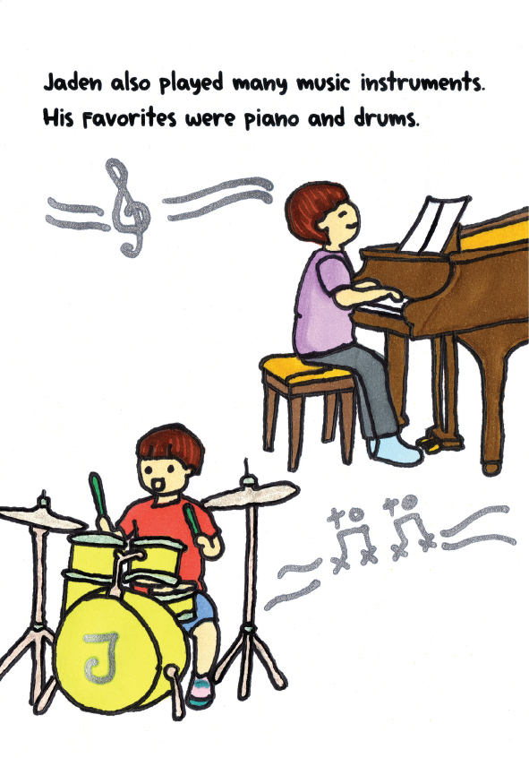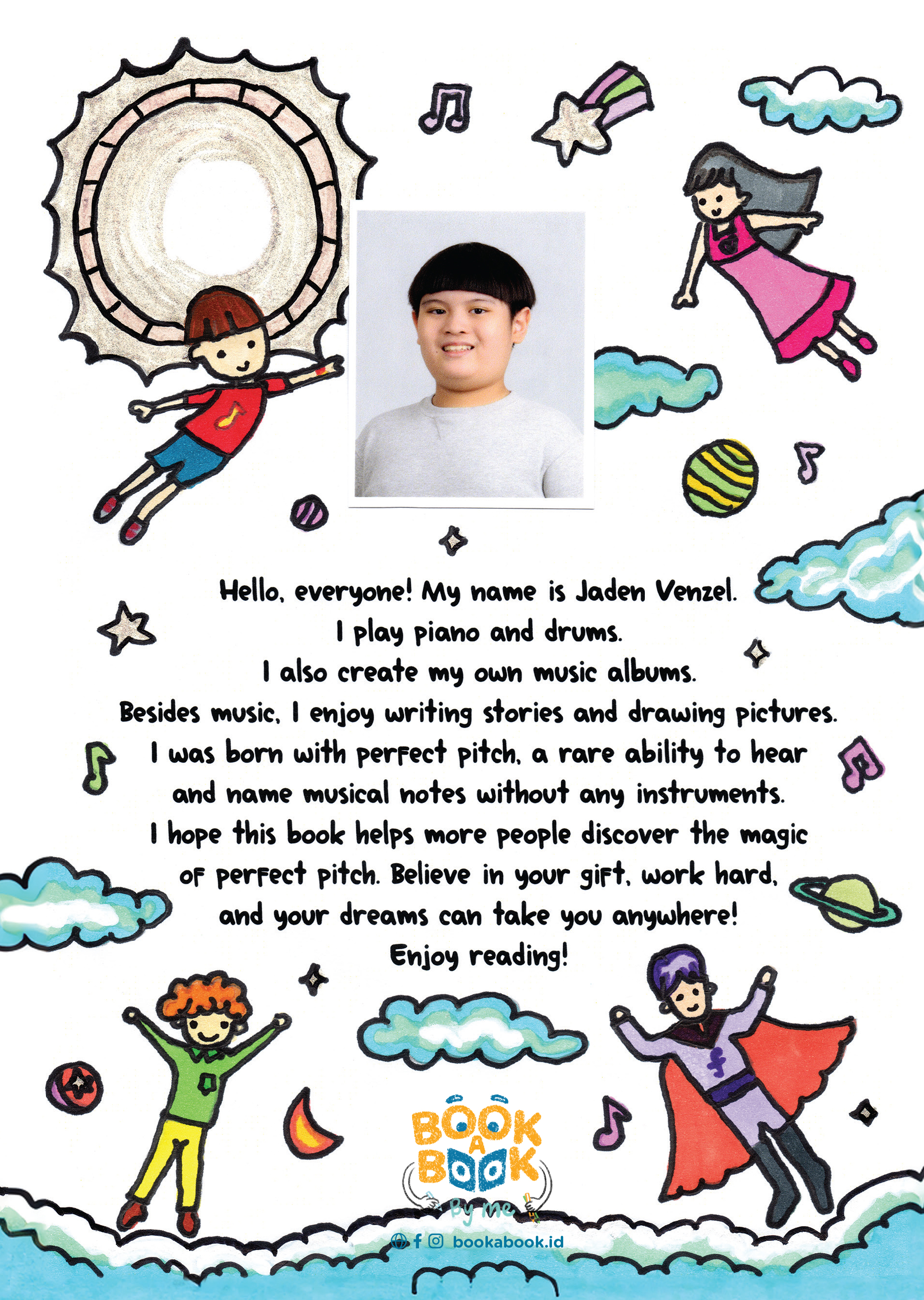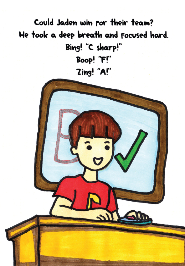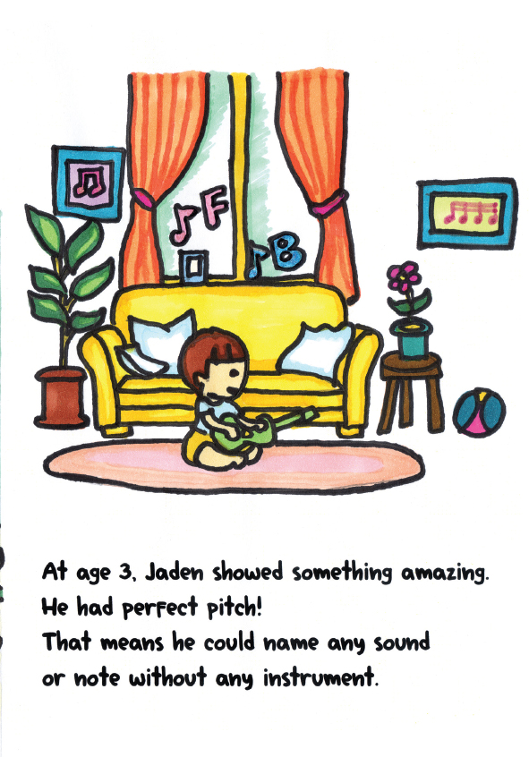 Hello, everyone! My name is Jaden Venzel. I play piano and drums. I also create my own music albums. Besides music, I enjoy writing stories and drawing pictures. I was born with perfect pitch, a rare ability to hear and name musical notes without any instruments. I hope this book helps more people discover the magic of perfect pitch. Believe in your gift, work hard, and your dreams can take you anywhere! Enjoy reading!