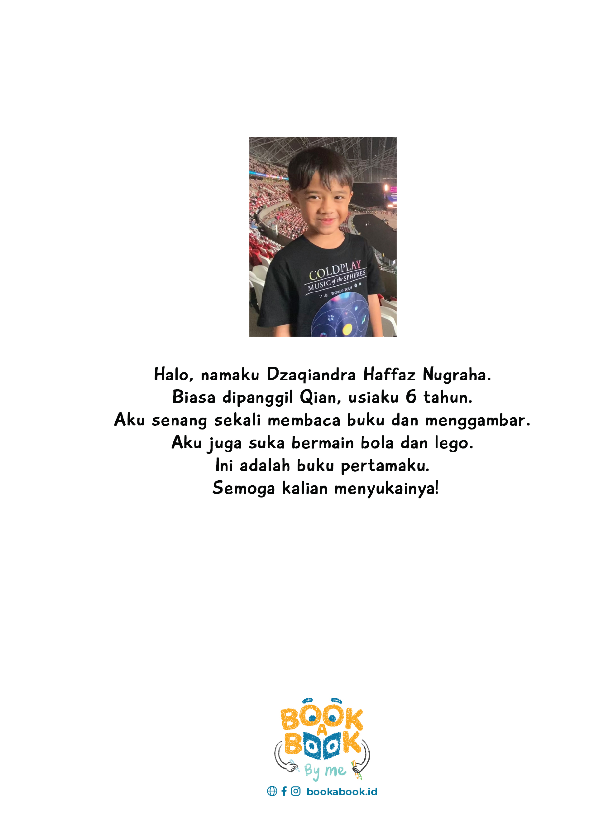Halo, namaku Dzaqiandra Haffaz Nugraha. Biasa dipanggil Qian, usiaku 6 tahun. Aku senang sekali membaca buku dan menggambar. Aku juga Suka bermain bola dan lego. Ini adalah buku pertamaku. Semoga kalian menyukainya!