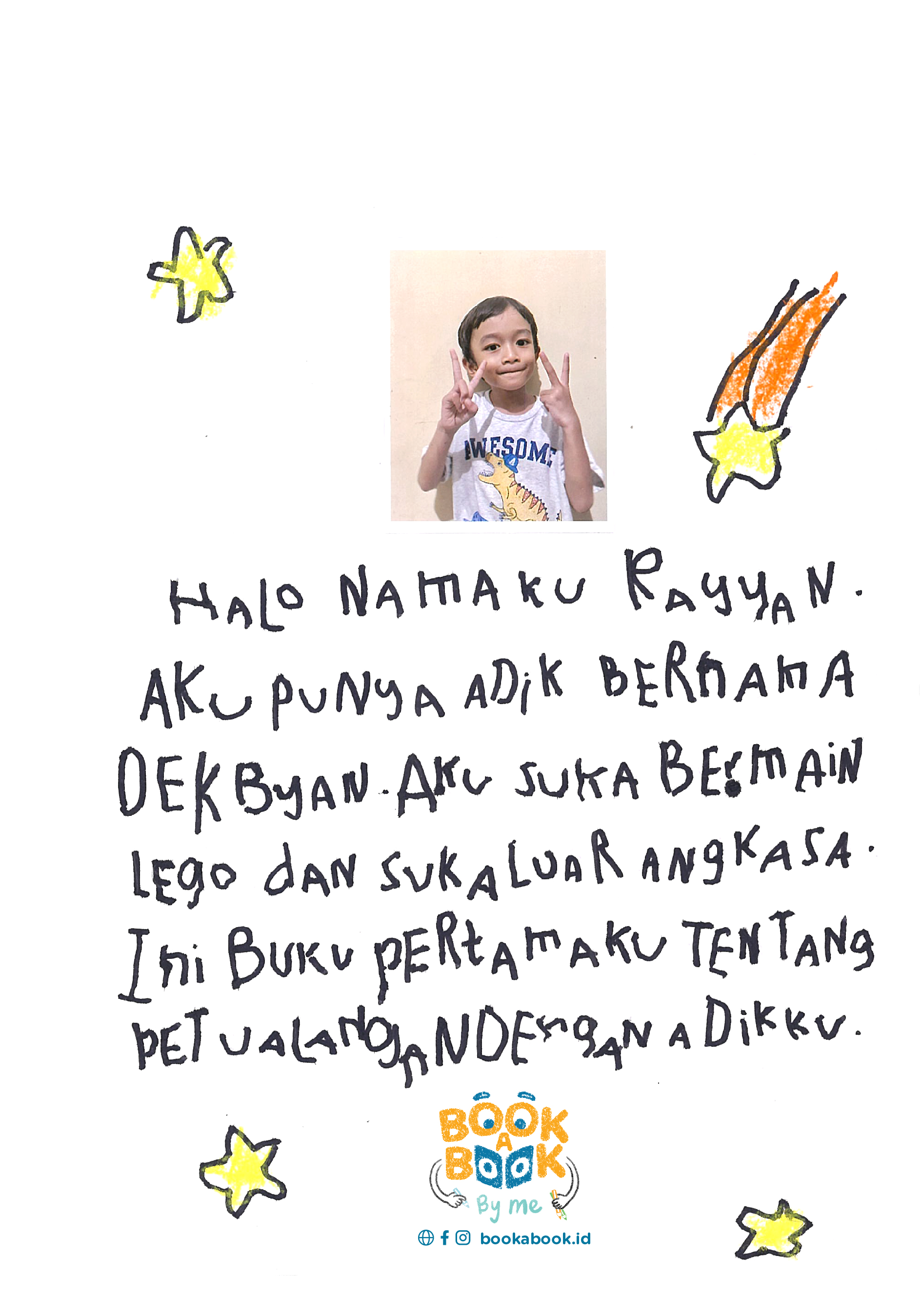 Halo namaku Rayyan. Aku punya adik bernama dek Byan. Aku suka bermain lego dan suka luar angkasa. Ini buku pertamaku tentang petualangan dengan adikku.