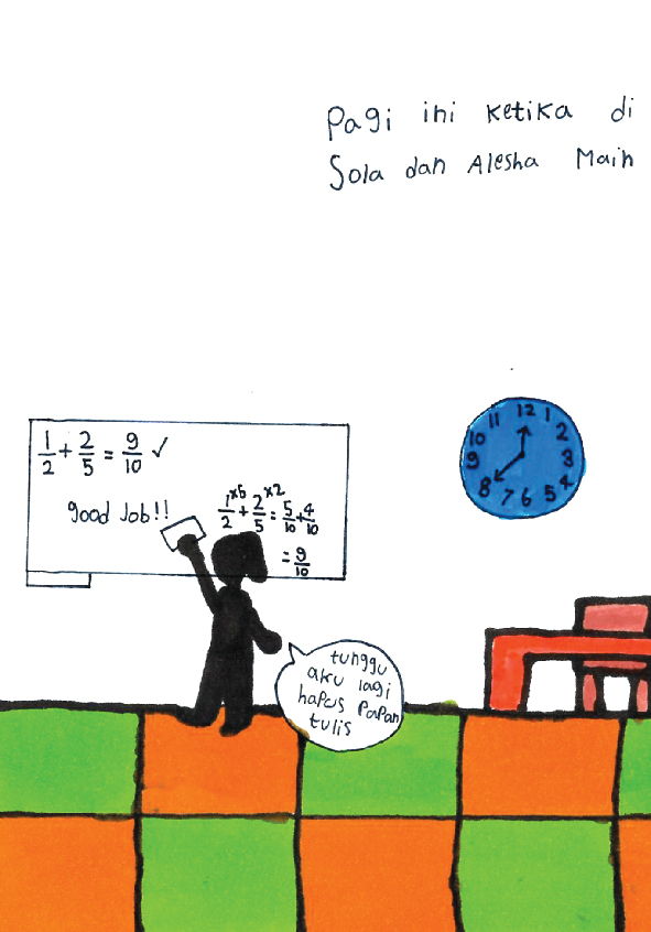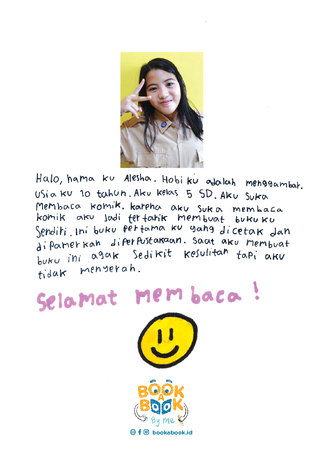 Halo, nama ku Alesha. Hobi ku adalah menggambar. usia ku 10 tahun. Aku kelas 5 SD. Aku suka membaca komik. karena aku suka membaca komik aku jadi tertarik membuat bukuku sendiri. Ini buku perta,a ku yang dicetak dan di pamerkan diperpustakaan. saat aku membuat ini agak sedikit kesulitan tapi aku tidak menyerah. Selamat membaca