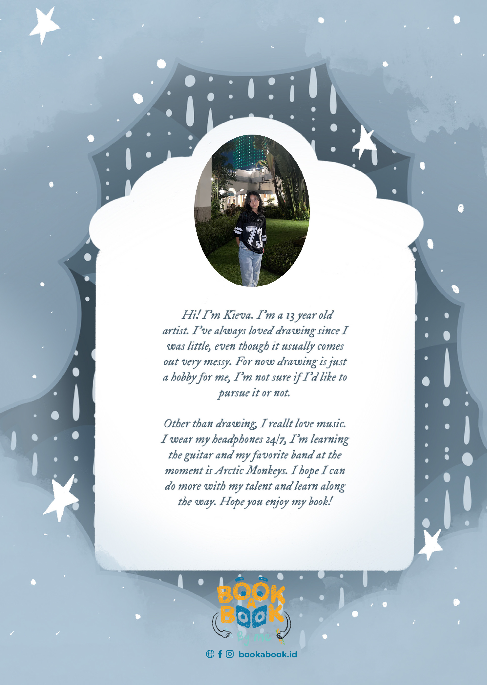 Hi! I'm Kieva. I’m a 13 year old artist. I’ve always loved drawing since I was little, even though it usually comes out very messy. For now drawing is just a hobby for me, I’m not sure if I’d like to pursue it or not. Other than drawing, I really love music. I wear my headphones 24/7, I’m learning the guitar and my favorite band at the moment is Arctic Monkeys. I hope I can do more with my talent and learn along the way. Hope you enjoy my book!