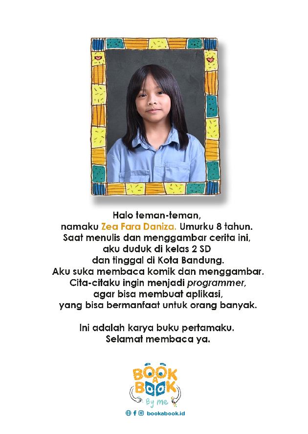 Halo teman-teman, namaku Zea Fara Daniza. Umurku 8 fahun. Saat menulis dan menggambar cerita ini aku duduk di kelas 2 SD dan tinggal di Kota Bandung. Aku suka membaca komik dan menggambar. Cita-citaku ingin menjadi programmer, agar bisa membuat aplikasi, yang bisa bermanfaat untuk orang banyak. Ini adalah karya buku pertamaku. Selamat membaca ya.